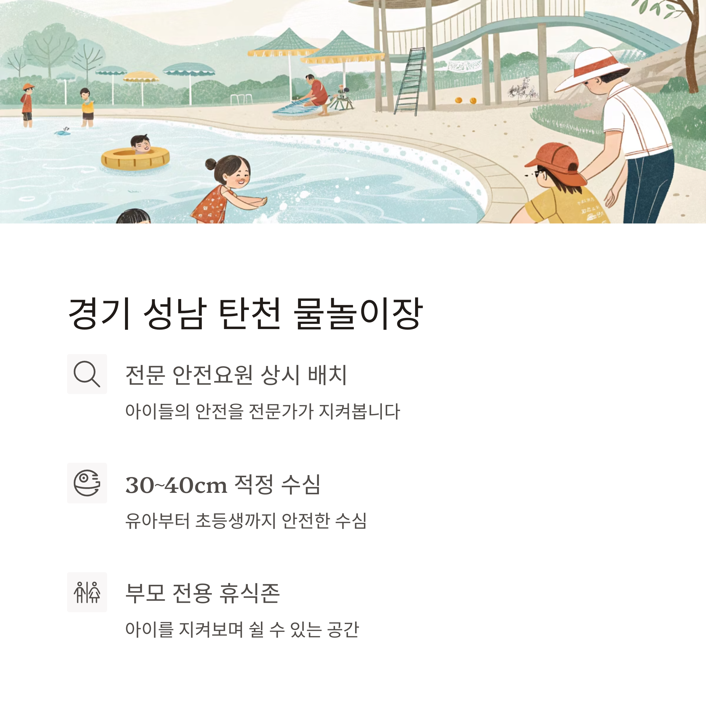 | 수심 확인 | 아이 기준 무릎 이하 수심이 이상적 |