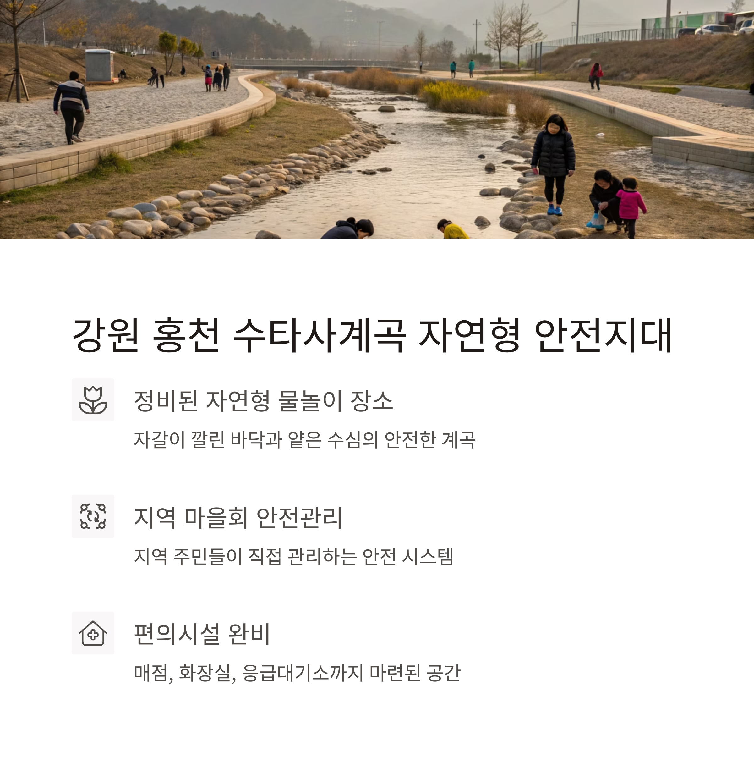 | 강원 홍천 | 수타사계곡 | 자연형, 마을회 운영 안전관리 시스템 |