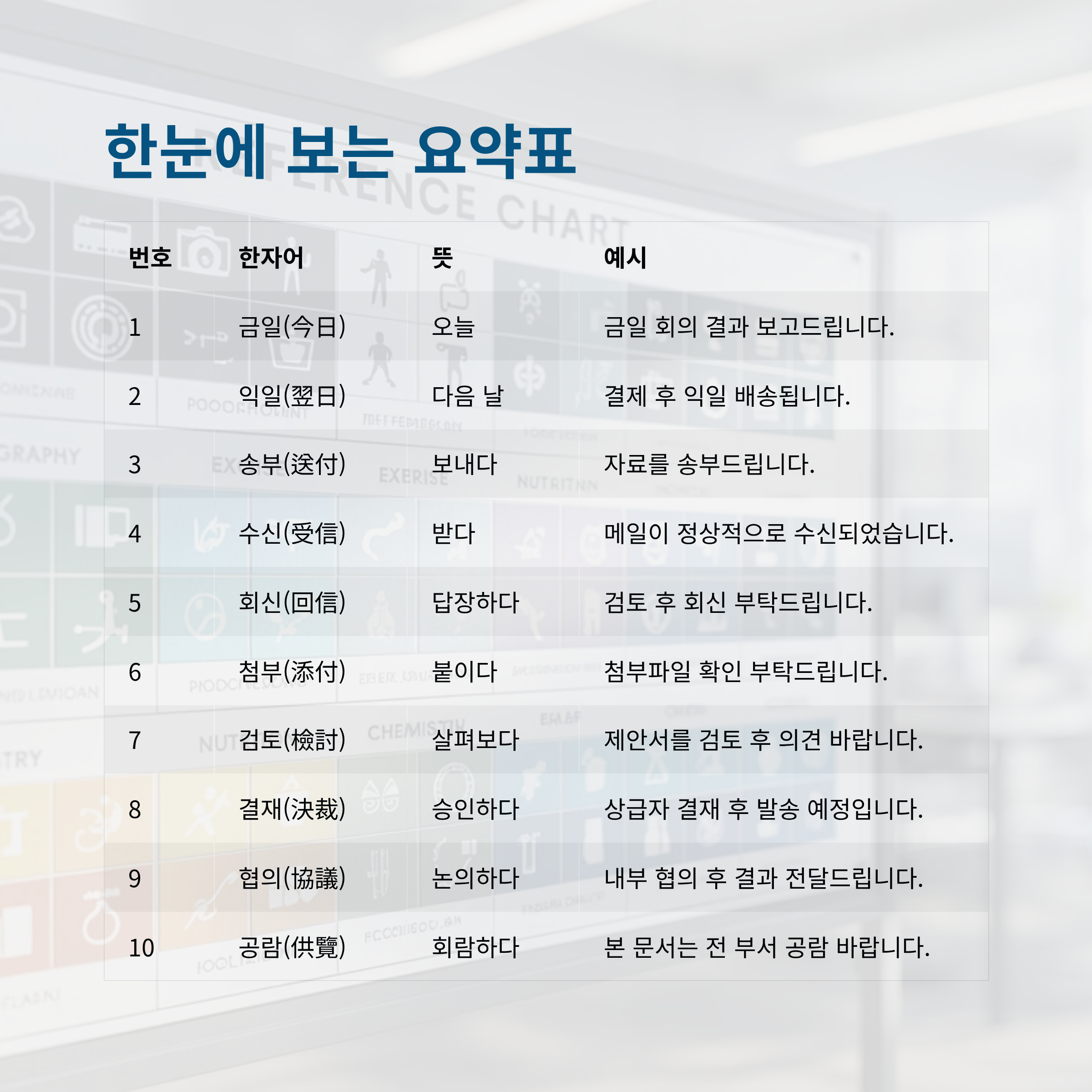 오늘은 이런 비즈니스 한자 표현 10가지를 뜻과 예시 문장과 함께 정리했습니다.