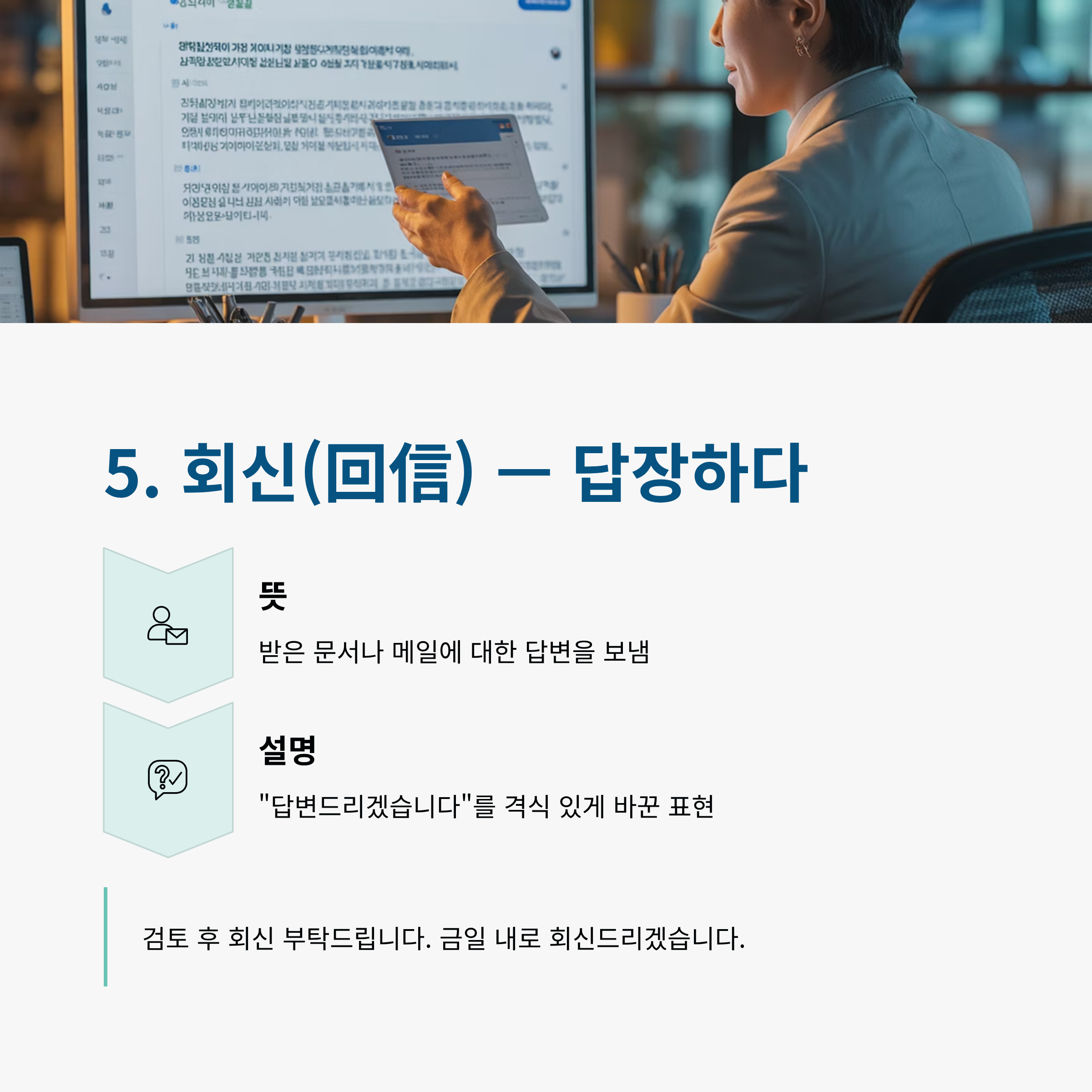 | 5 | 회신(回信) | 답장하다 | 검토 후 회신 부탁드립니다. |
