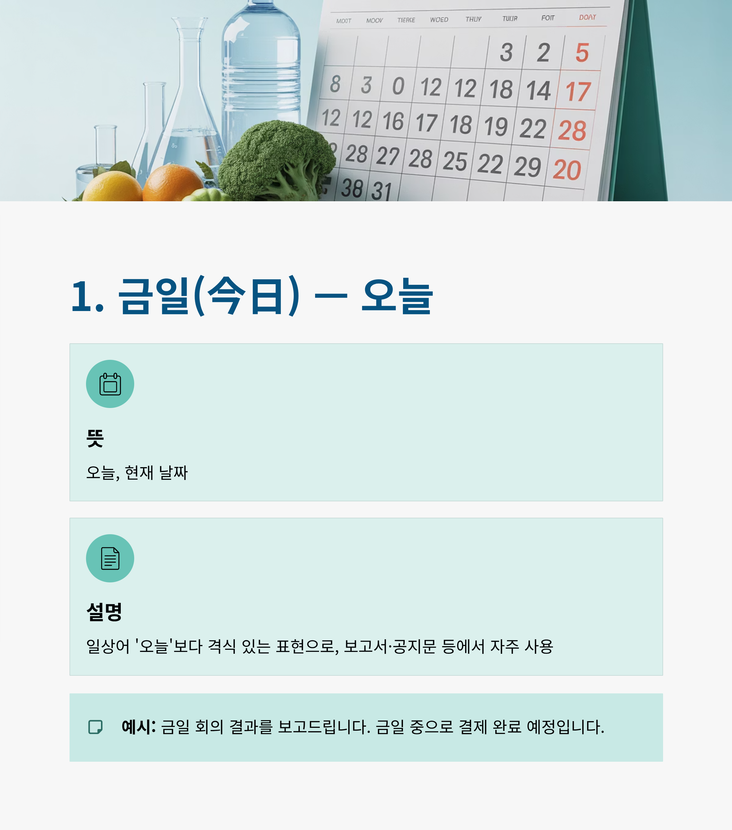- 설명: 일상어 ‘오늘’보다 격식 있는 표현으로, 보고서·공지문 등에서 자주 사용