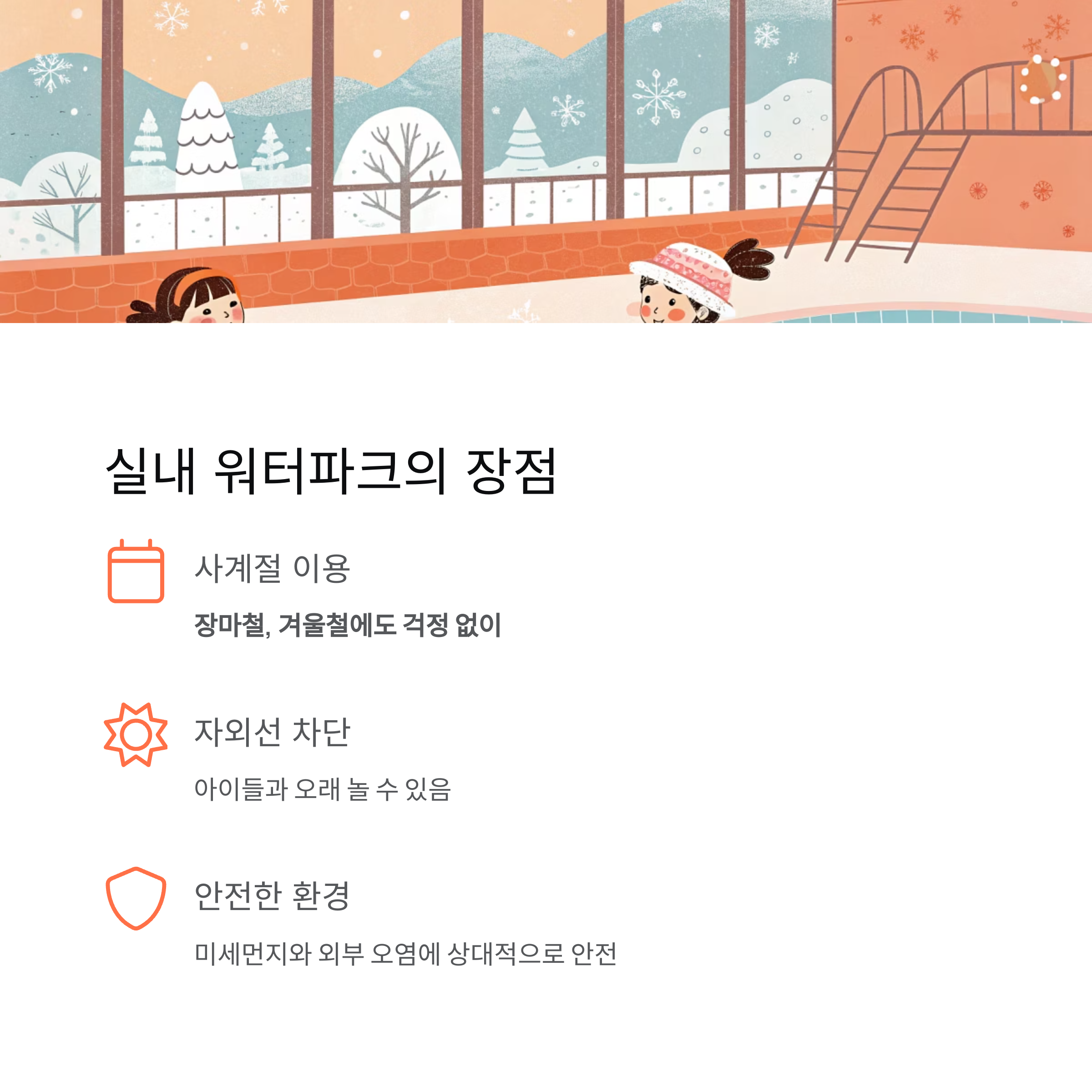 장마철, 겨울철에도 걱정 없이 물놀이를 즐길 수 있다는 점이 가장 큰 장점입니다.