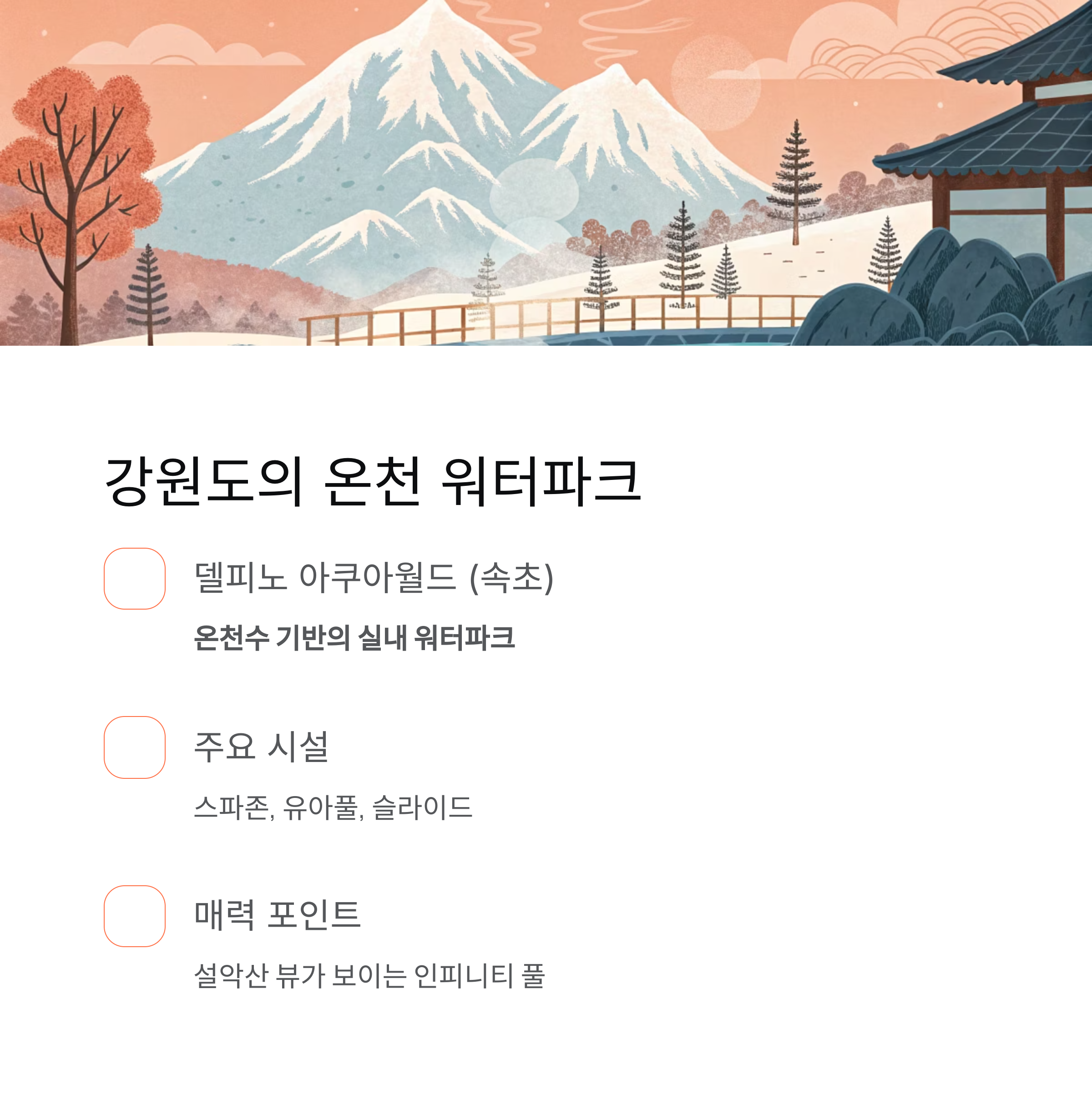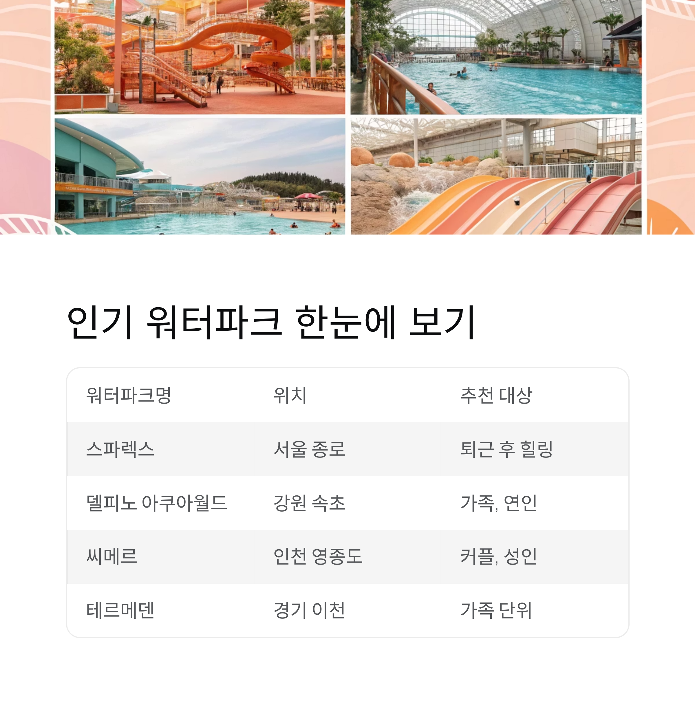 | 델피노 아쿠아월드 | 강원 속초 | 온천수, 인피니티풀 | 가족, 연인 |