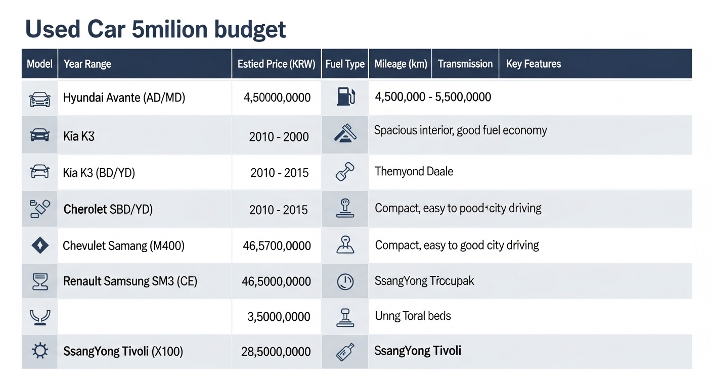 500만원대 예산으로 구매할 수 있는 중고차는 생각보다 다양합니다. 주로 소형차나 준중형차가 이 가격대에 포진해 있으며, 저는 사회초년생들이라면 유지비가 저렴하고 잔고장이 적은 모델을 우선적으로 고려하는 것을 권장합니다. 2025년 현재 시장 상황과 소비자 선호도를 고려했을 때, 다음 모델들이 좋은 선택지가 될 수 있습니다.