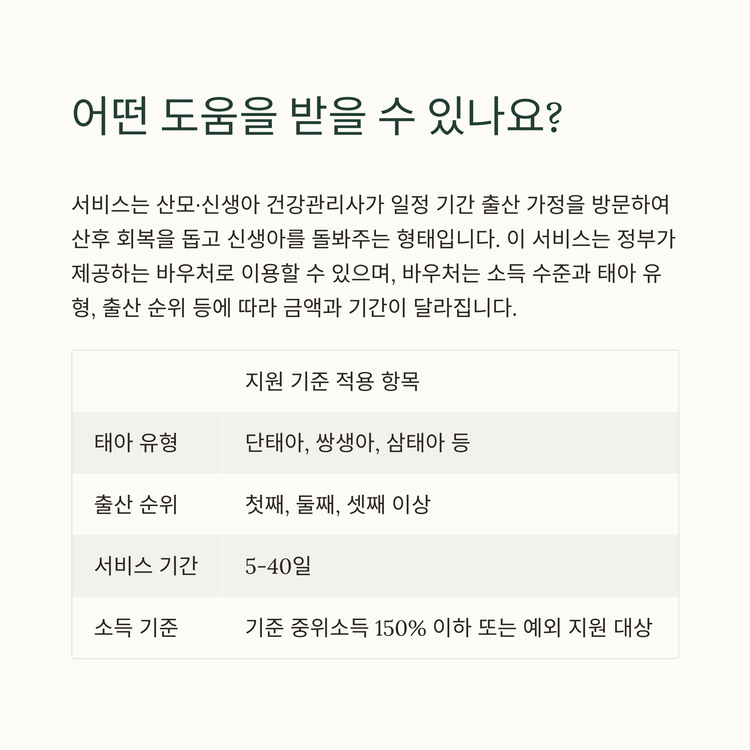 서비스는 산모·신생아 건강관리사가 일정 기간 출산 가정을 방문하여 산후 회복을 돕고 신생아를 돌봐주는 형태입니다. 이 서비스는 정부가 제공하는 바우처로 이용할 수 있으며, 바우처는 소득 수준과 태아 유형, 출산 순위 등에 따라 금액과 기간이 달라집니다.