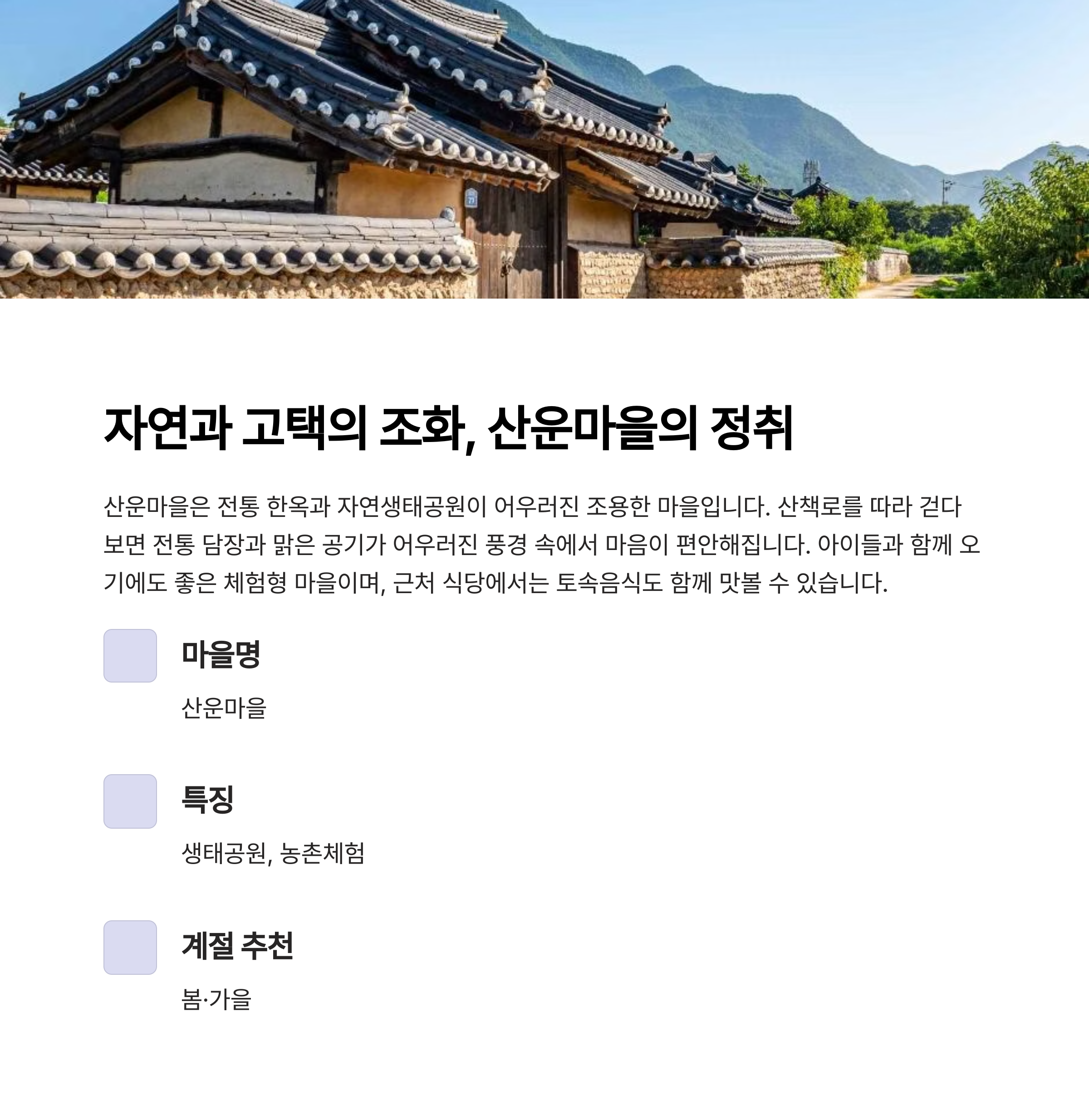 산운마을은 전통 한옥과 자연생태공원이 어우러진 조용한 마을입니다.