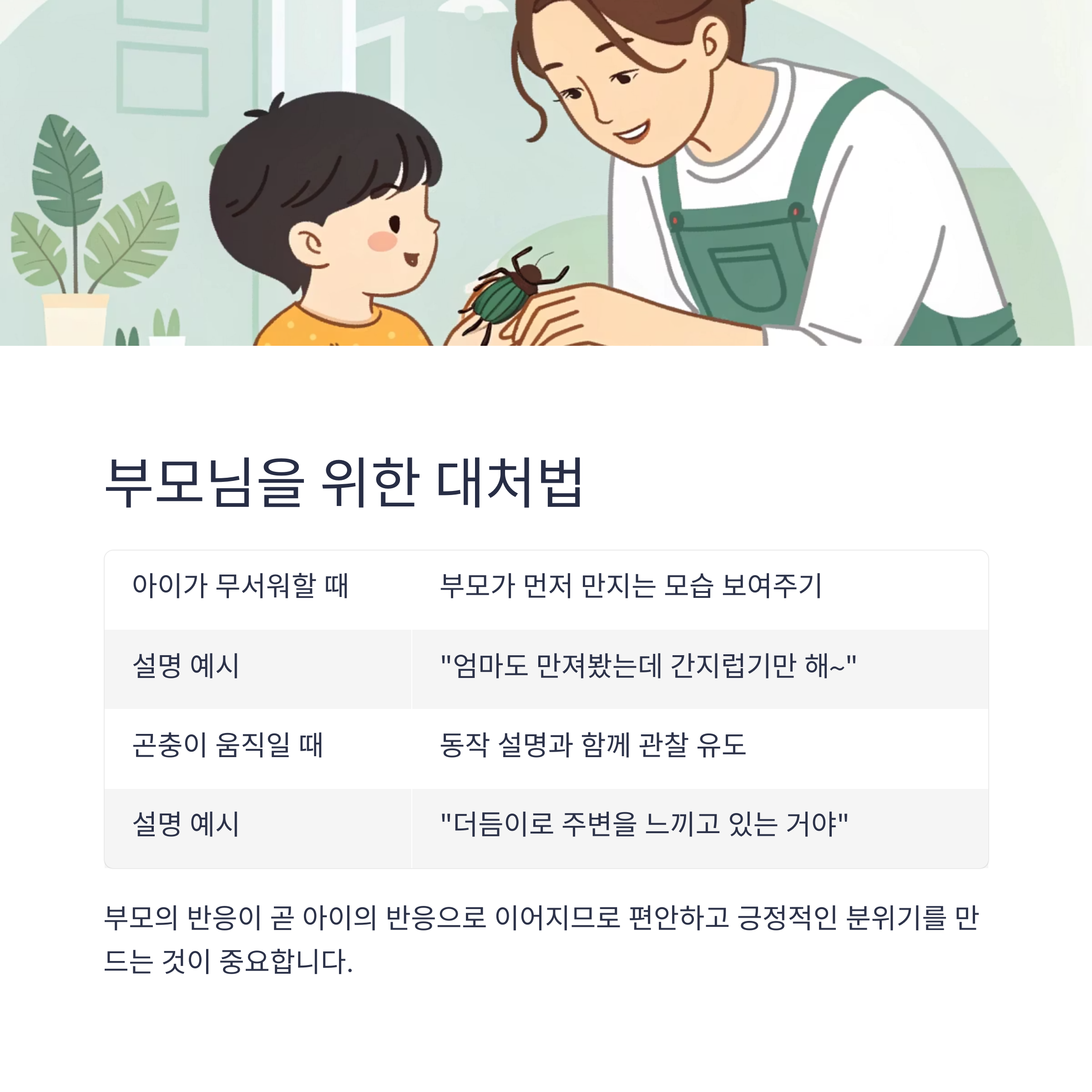 | 곤충이 움직일 때 | 동작 설명과 함께 관찰 유도 | "더듬이로 주변을 느끼고 있는 거야" |