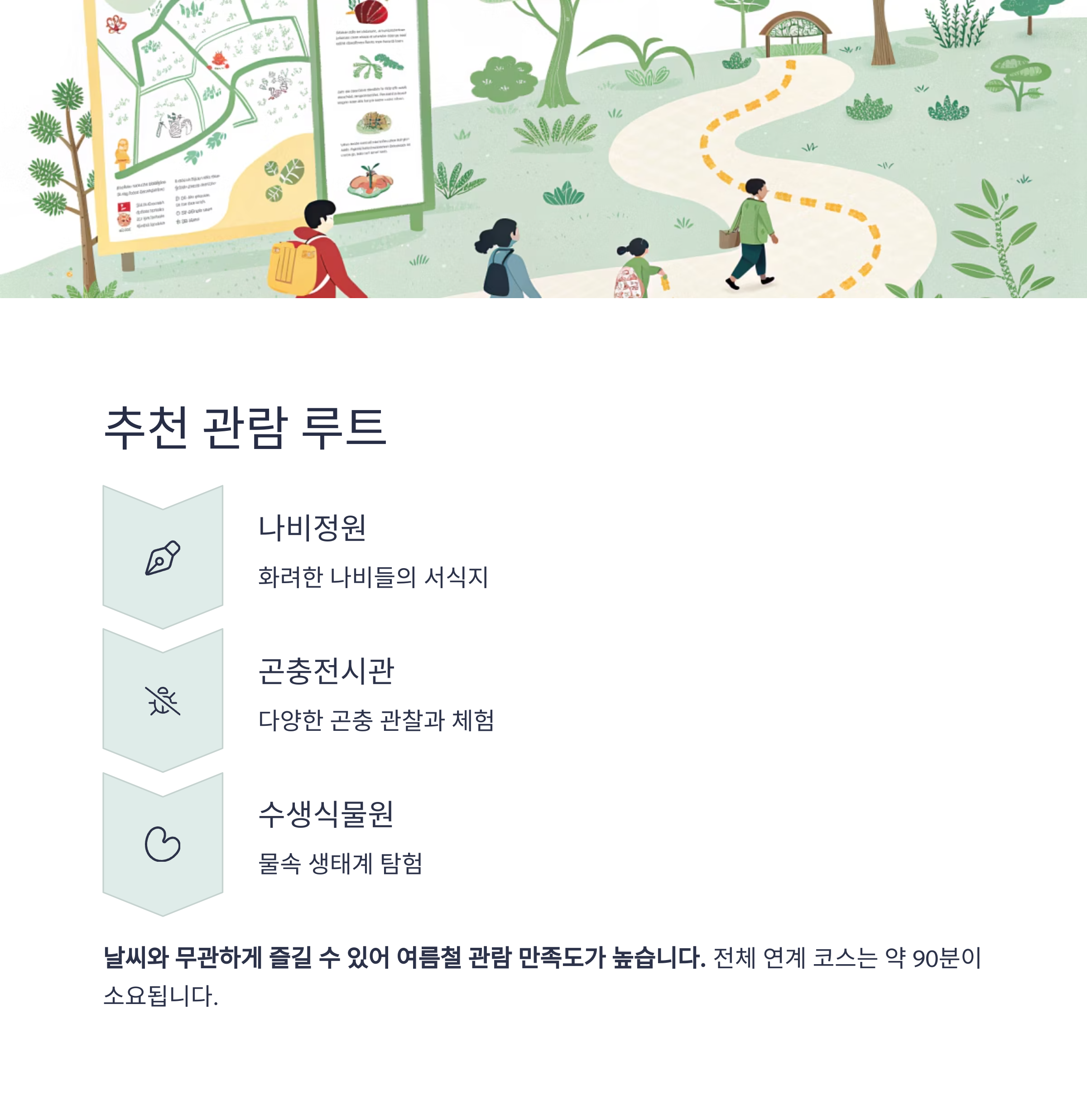 | 전체 연계 | 나비정원 → 곤충전시관 → 수생식물원 | 약 90분 |