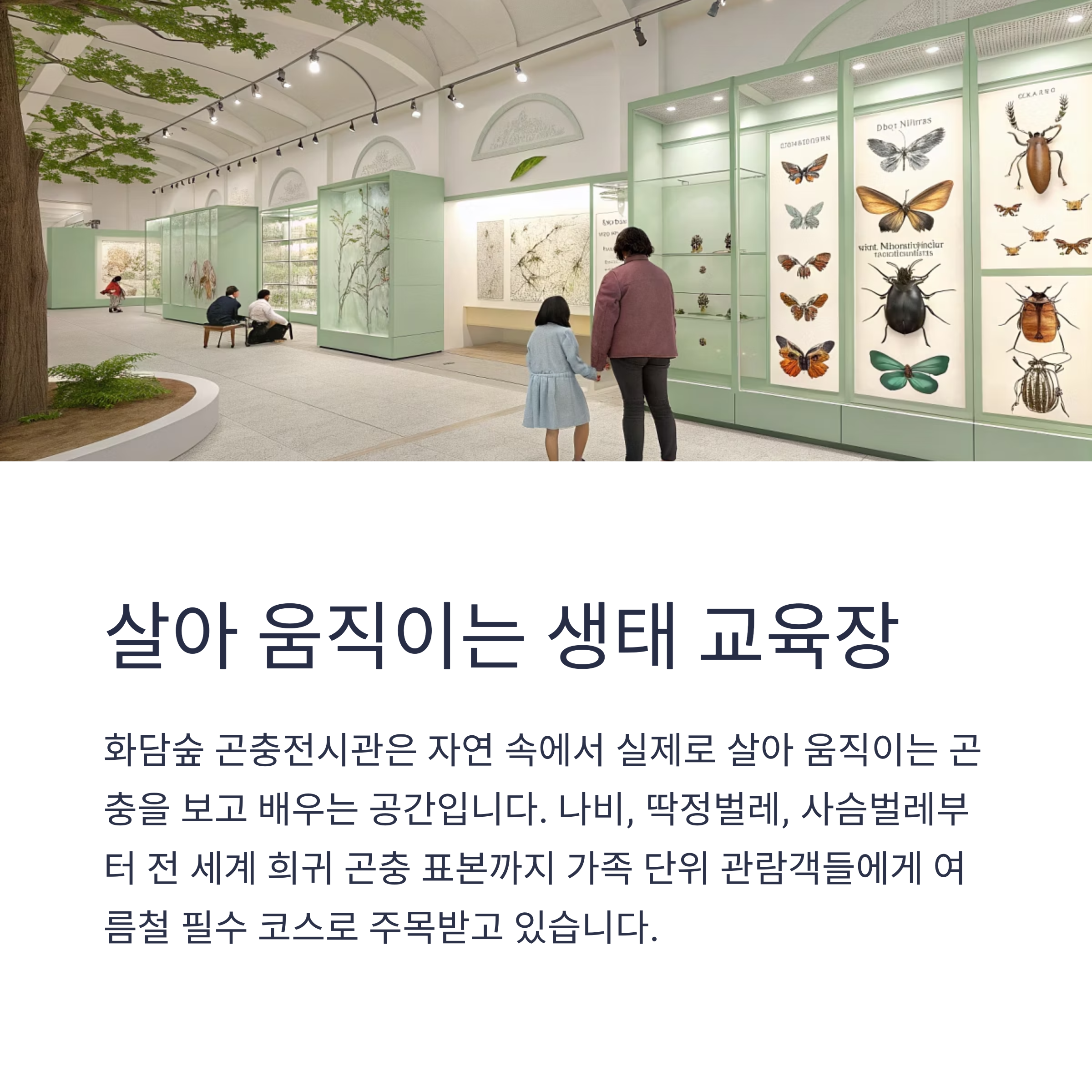 | 생태관 | 살아있는 곤충 관찰 | 나비, 장수풍뎅이 등 직접 체험 가능 |