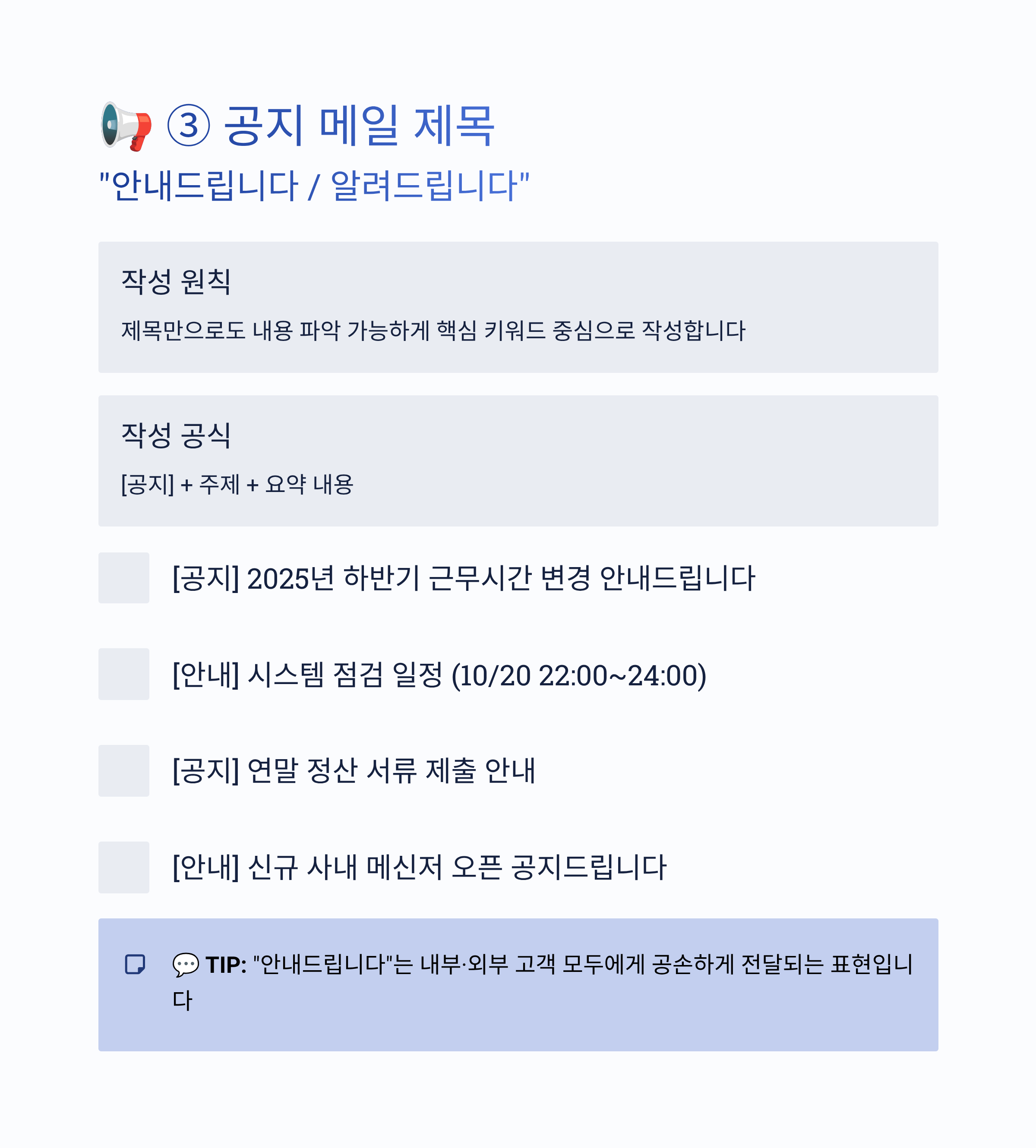 공지나 안내 메일은 제목만으로도 내용을 파악할 수 있어야 합니다.