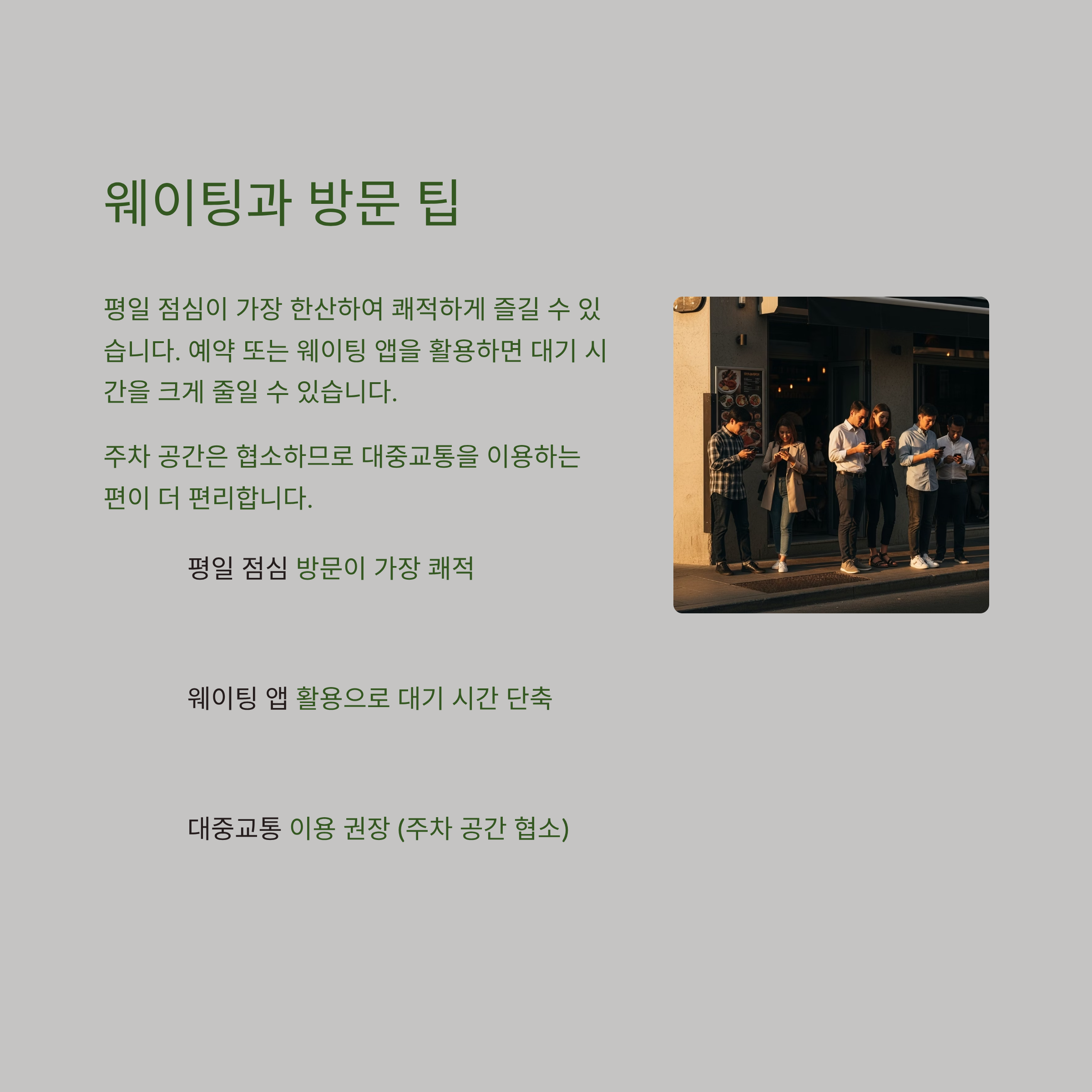 | 방문 팁 | 평일 점심 추천, 예약·웨이팅앱 활용, 대중교통 유리 |