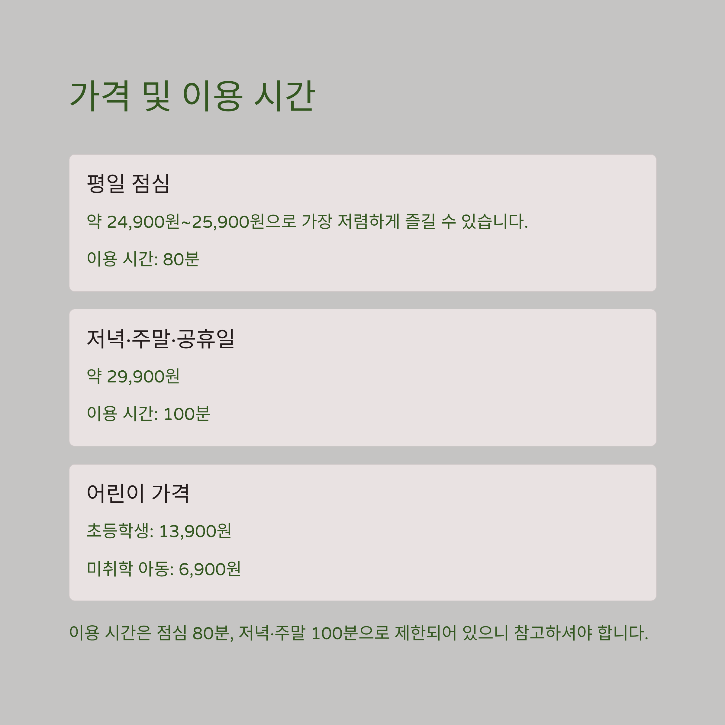 | 가격대 | 평일 점심 24,900원~25,900원 / 저녁·주말 29,900원 |
