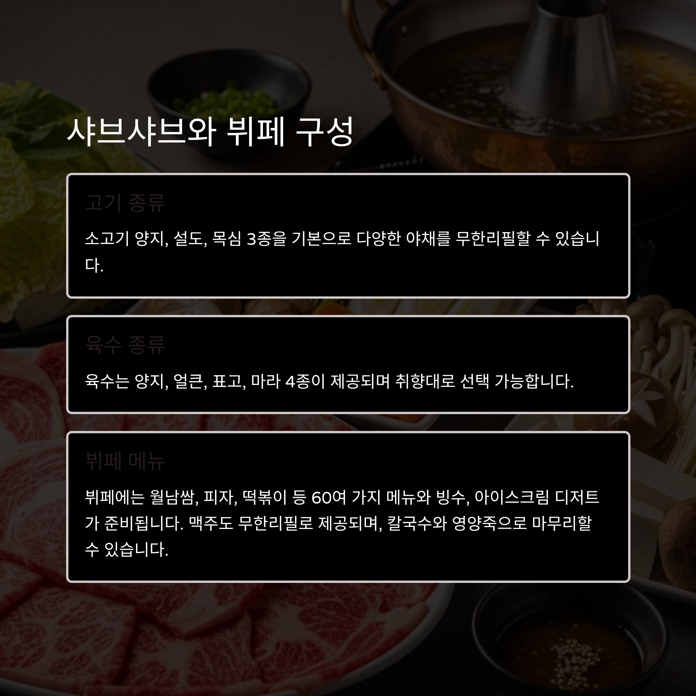 | 구성 요소 | 소고기 3종, 야채 뷔페, 월남쌈, 디저트, 맥주 무제한 |
