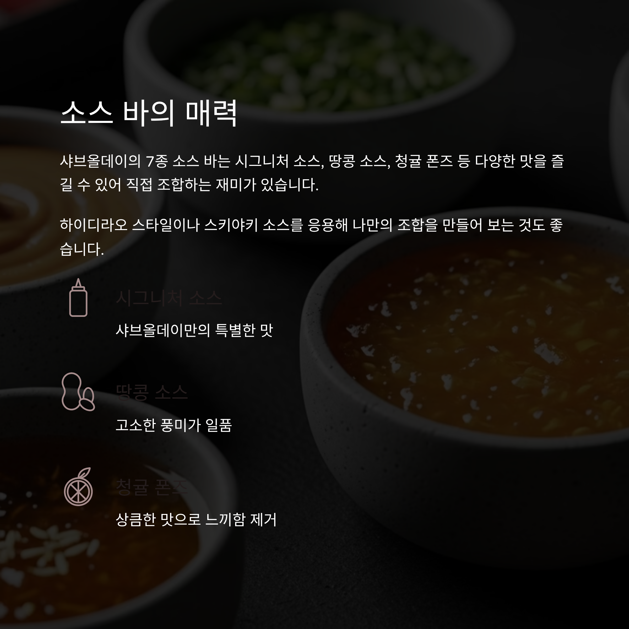 샤브올데이의 7종 소스 바는 시그니처 소스, 땅콩 소스, 청귤 폰즈 등