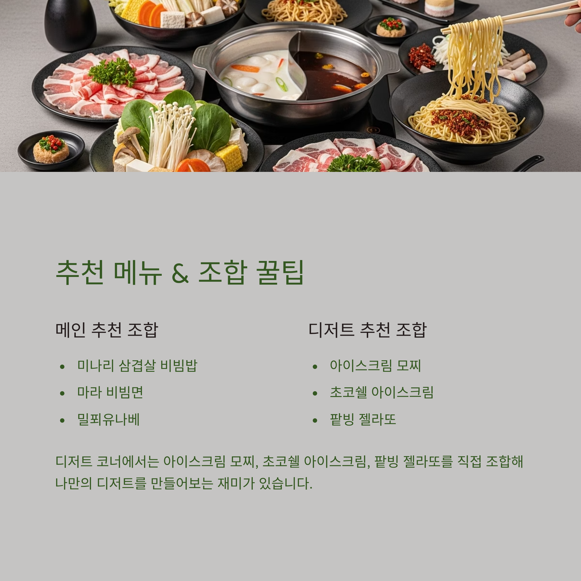 | 별미 메뉴 | 마라 비빔면, 밀푀유나베, DIY 디저트 조합 |