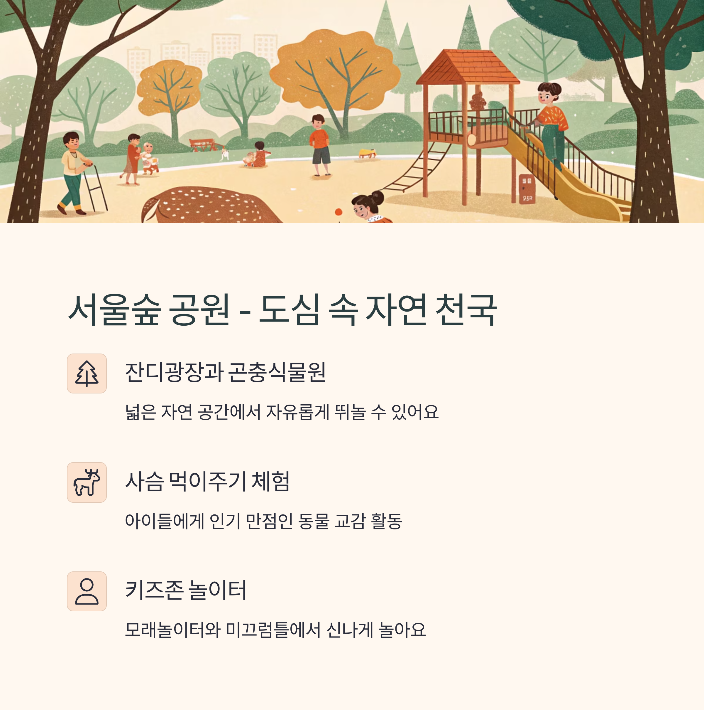 | 서울숲 | 사슴체험, 놀이터 | 자연형 복합공원 |