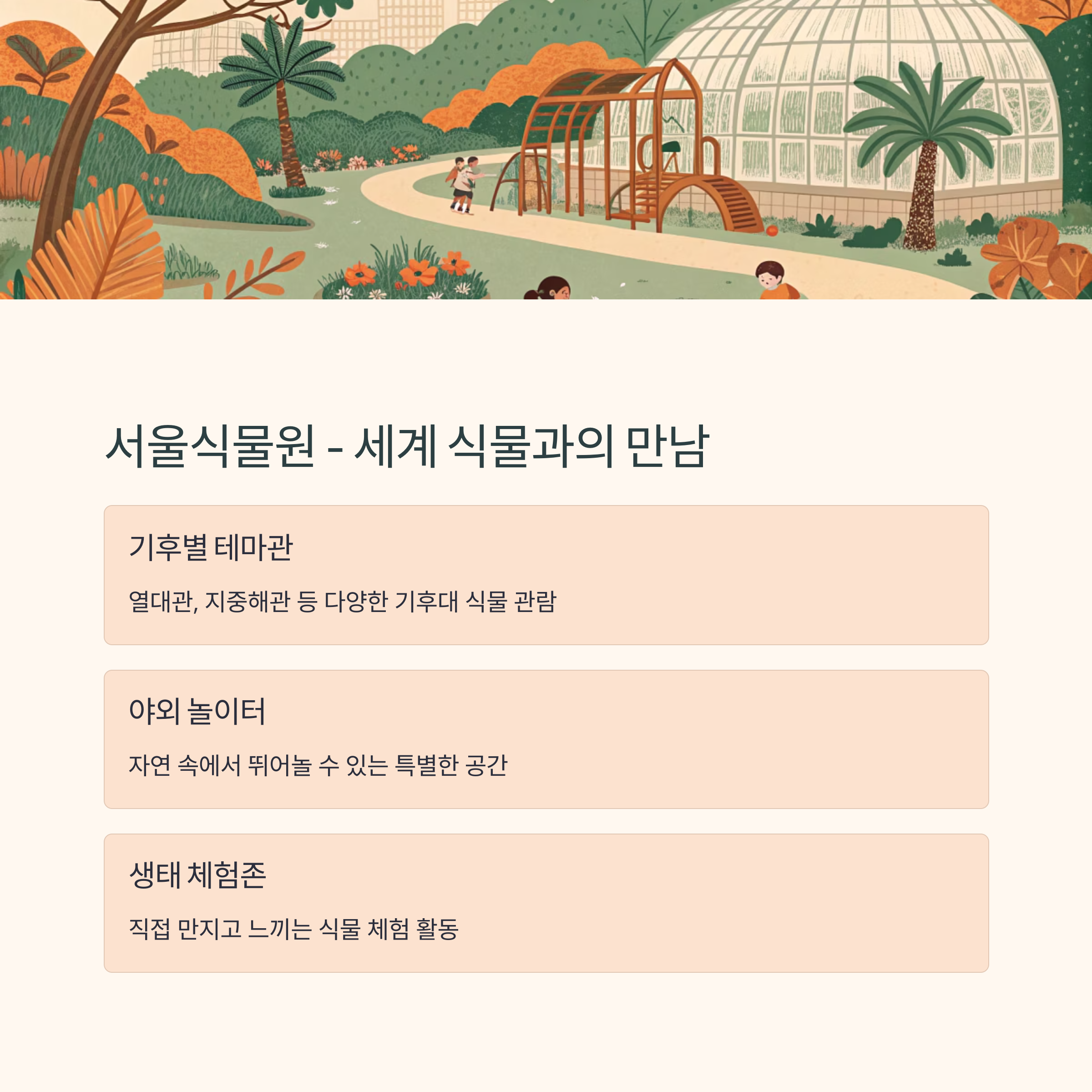 | 서울식물원 | 실내정원, 체험존 | 기후별 식물학습 |