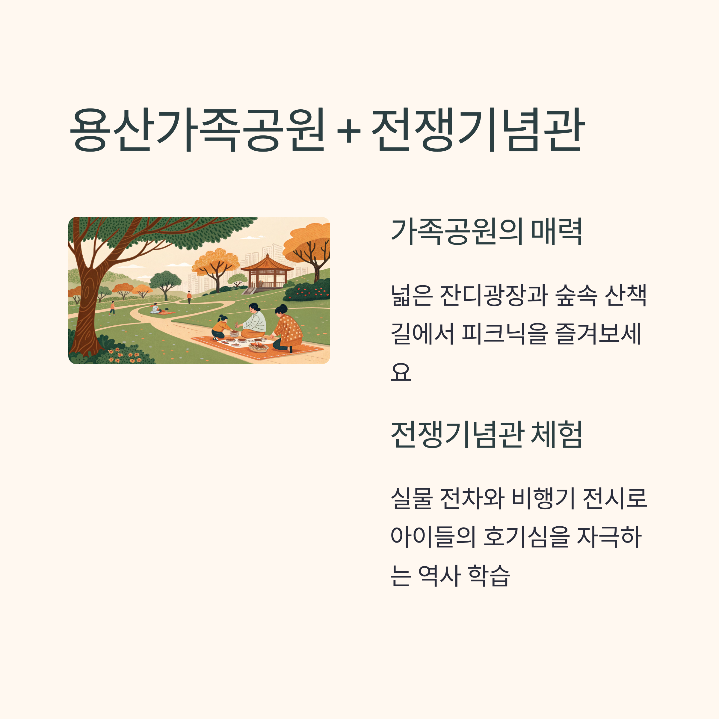 | 용산공원 | 잔디, 전쟁기념관 | 역사+놀이 결합형 |