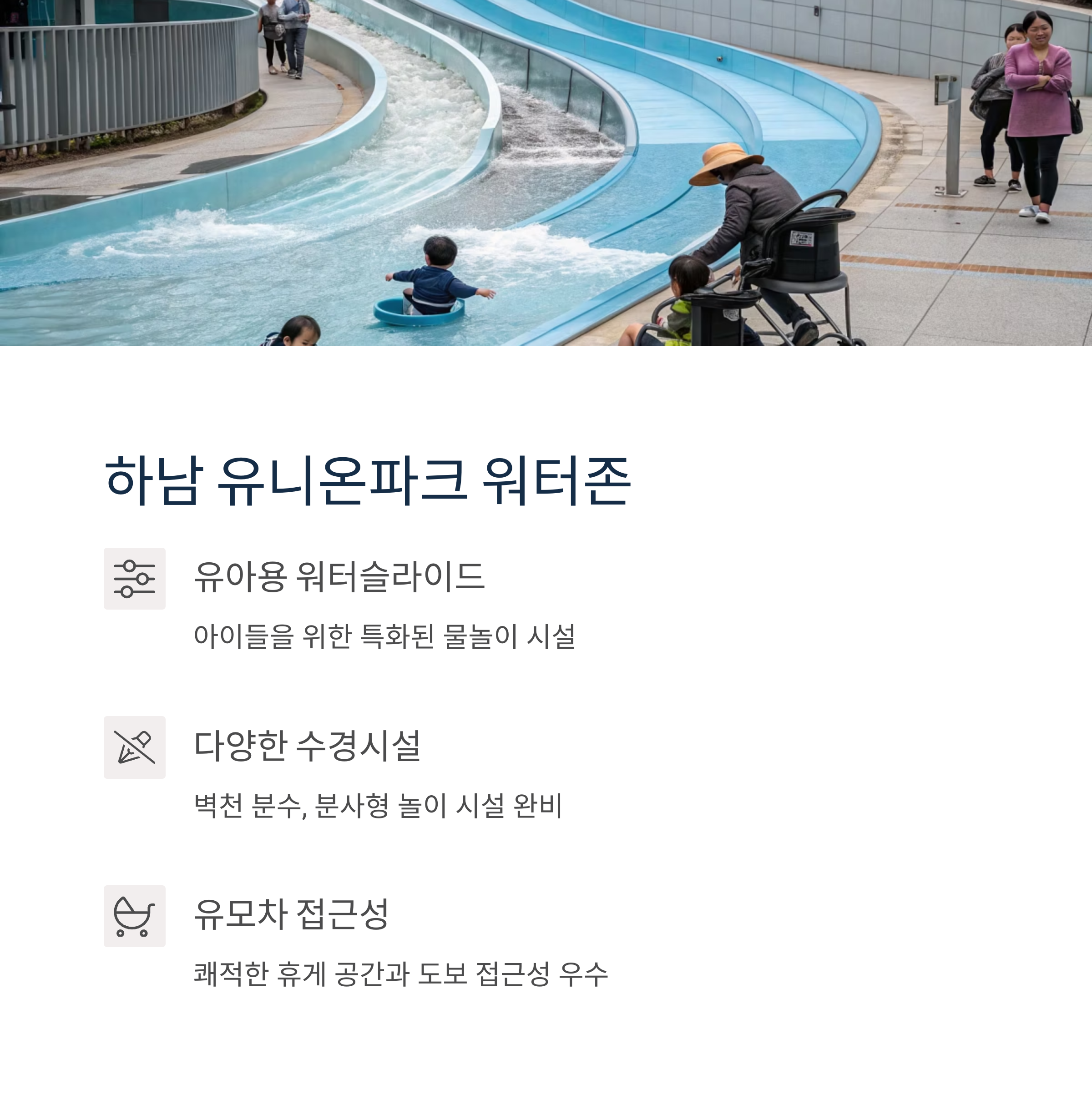 | 하남 | 유니온파크 워터존 | 유아 전용시설, 유모차 접근 가능 |
