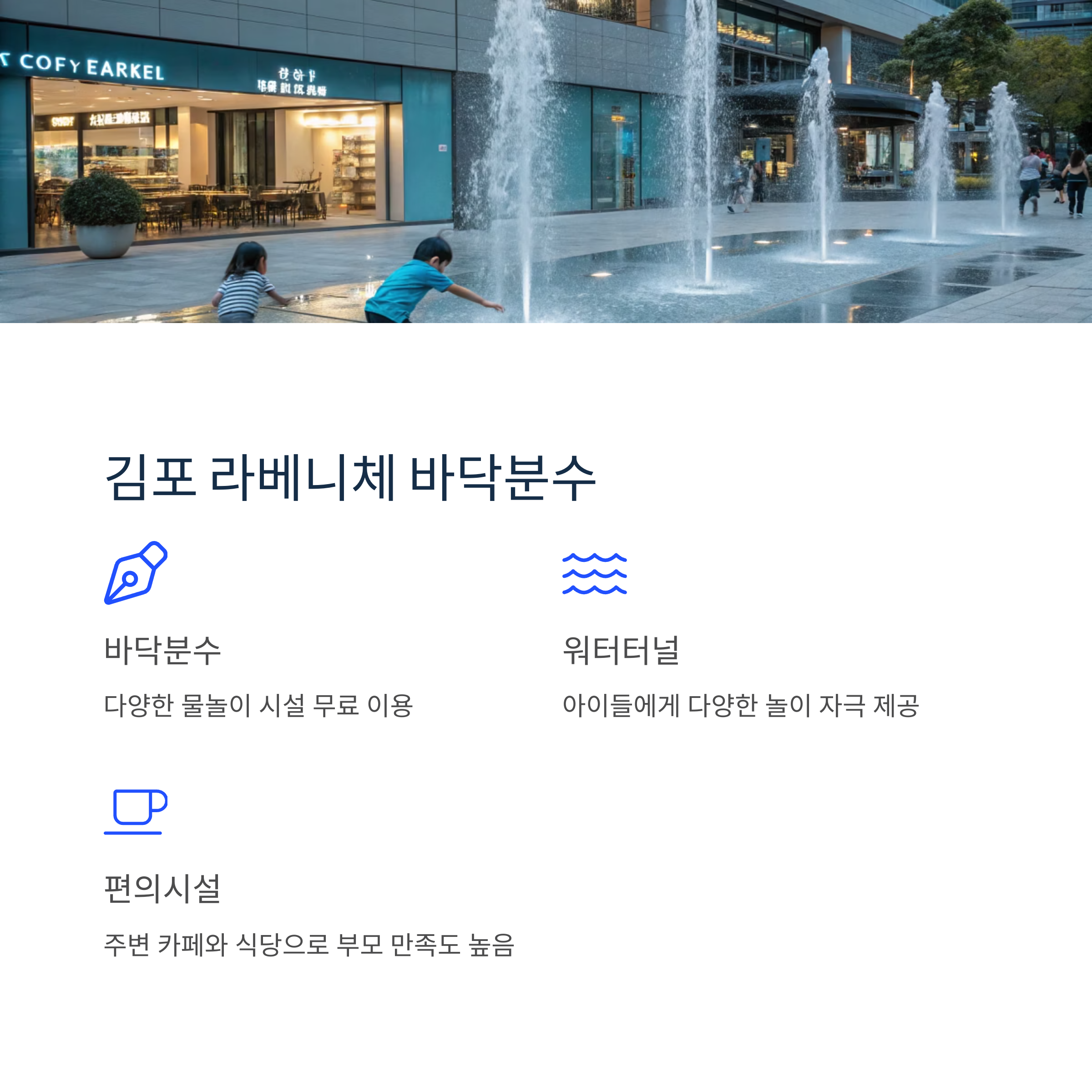 | 김포 | 라베니체 수경시설 | 도심형 바닥분수, 식음료 인접 |