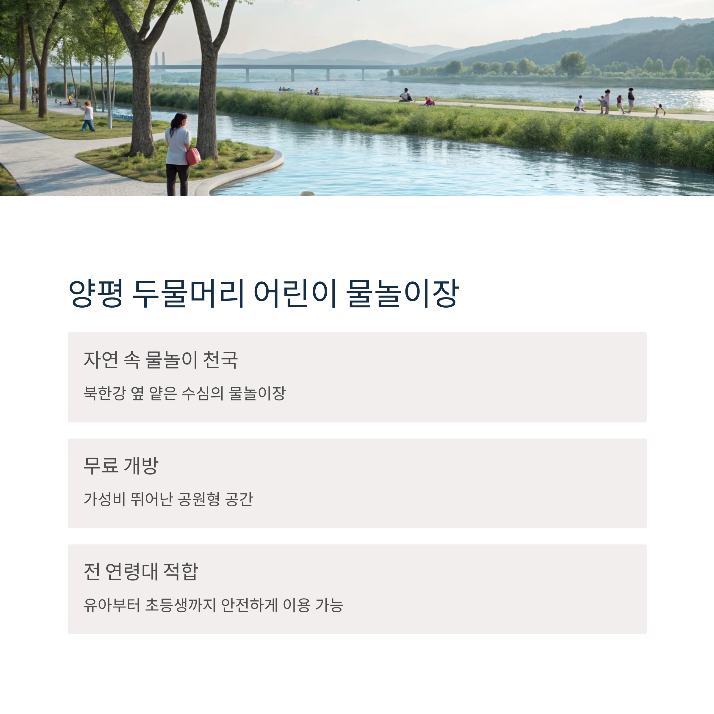 | 양평 | 두물머리 물놀이장 | 북한강 옆 자연형, 무료 이용 가능 |