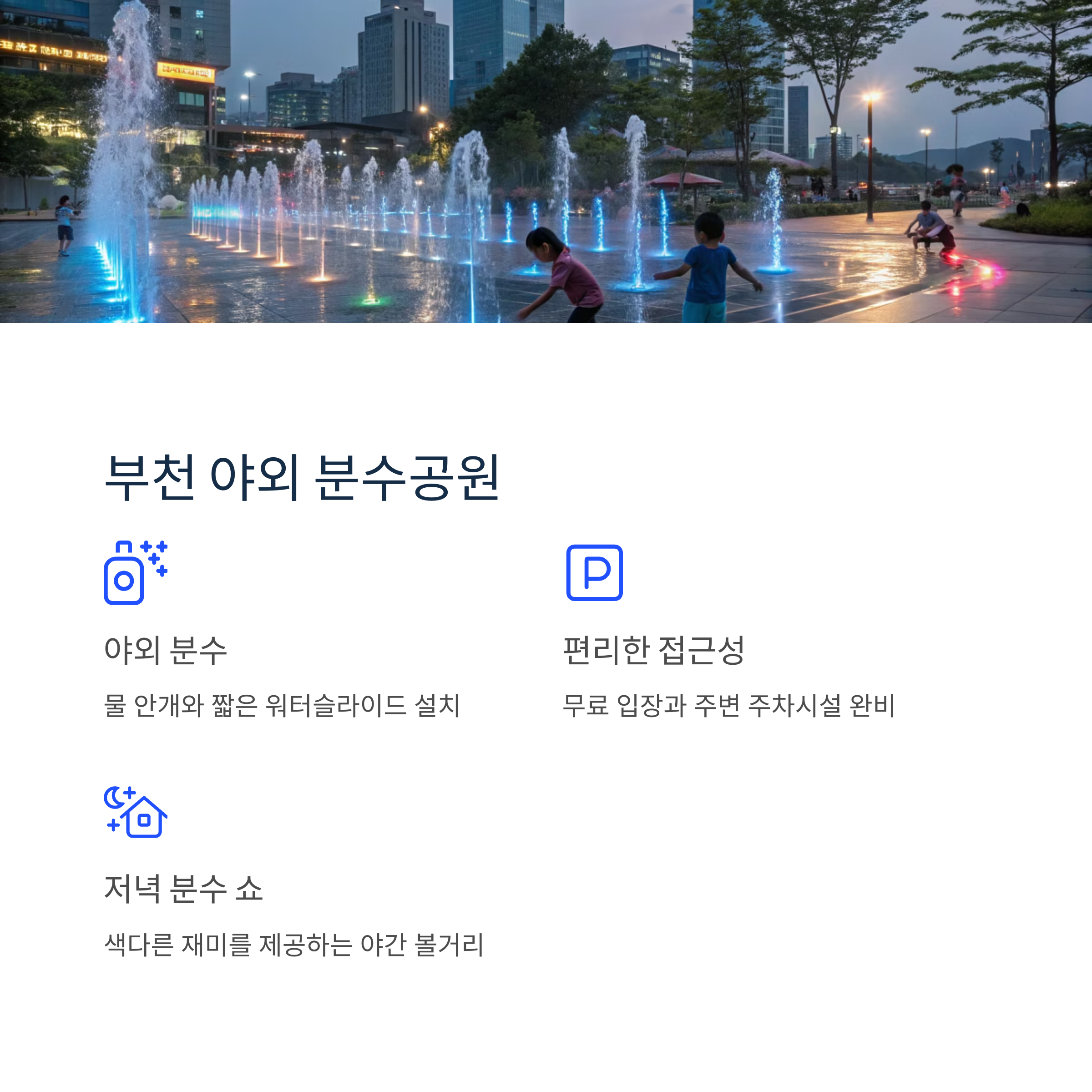 | 부천 | 야외 분수공원 | 도심 접근성 우수, 저녁 분수쇼 |