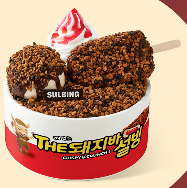 빙수 위에 돼지바 아이스크림이 통째로 올라가 시각적인 만족도가 큽니다. 초코 쉘을 직접 깨먹는 재미는 다른 빙수와 차별화된 포인트입니다.