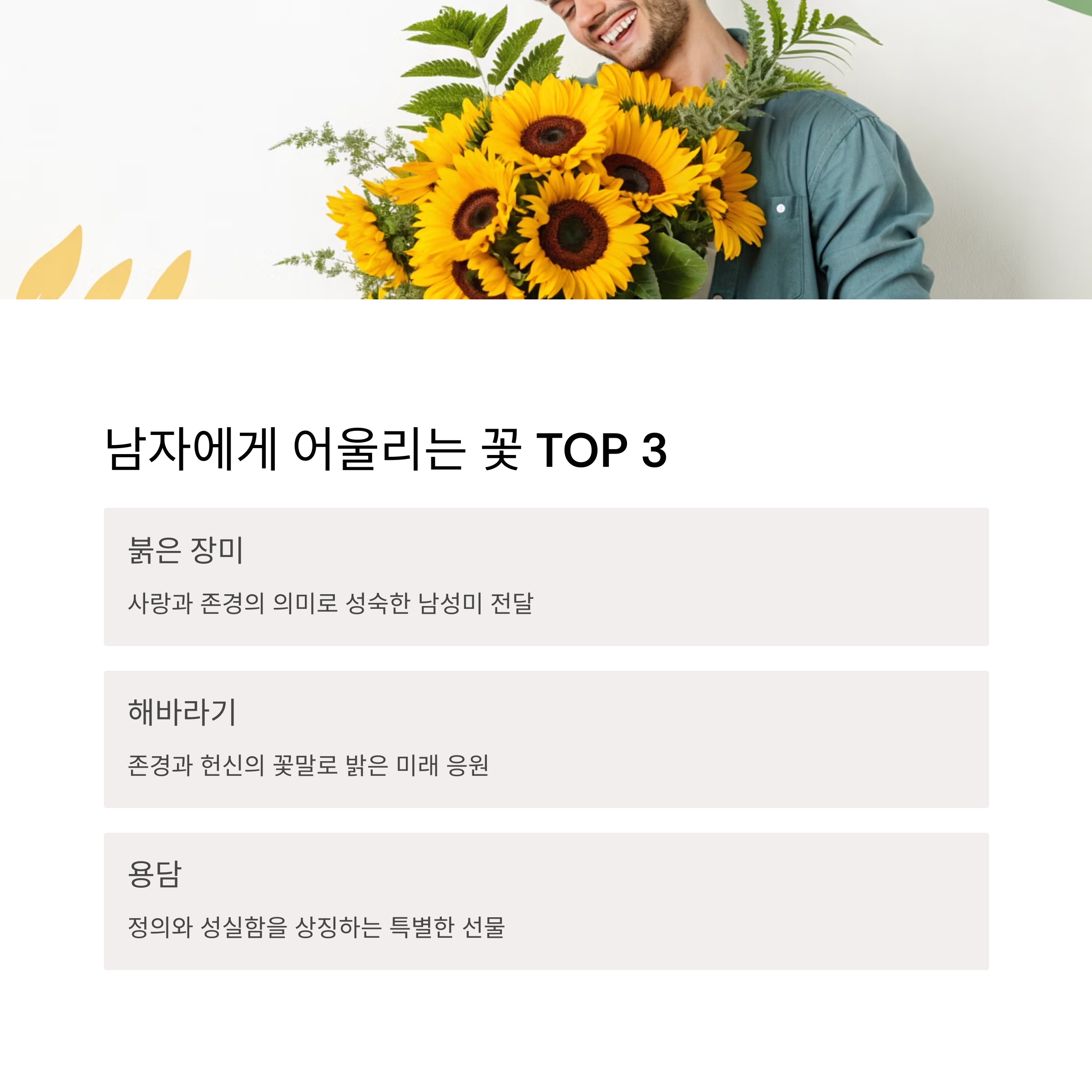 | 해바라기 | 남자 | 존경, 긍정 | 밝고 힘찬 |