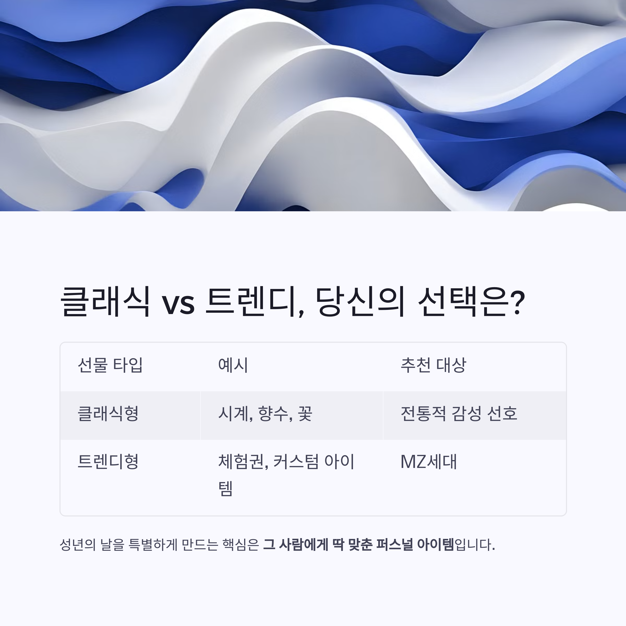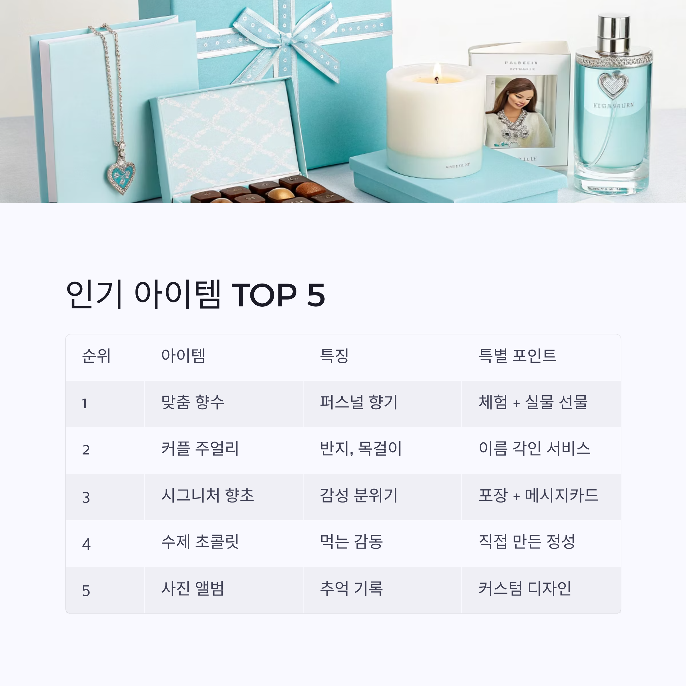| 클래식형 | 시계, 향수, 꽃 | 전통적 감성을 선호하는 이 |