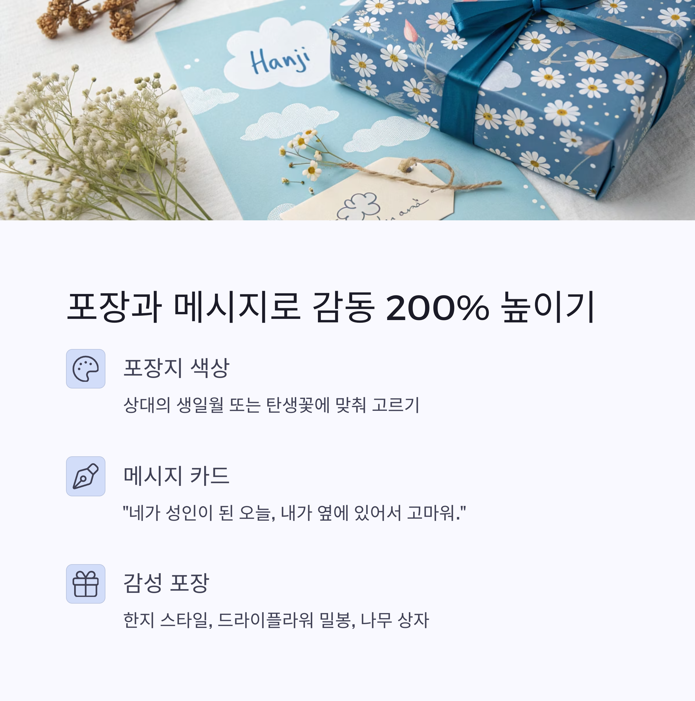 예) "네가 성인이 된 오늘, 내가 옆에 있어서 고마워." - 감성 포장 추천: 한지 스타일, 드라이플라워 밀봉, 나무 상자