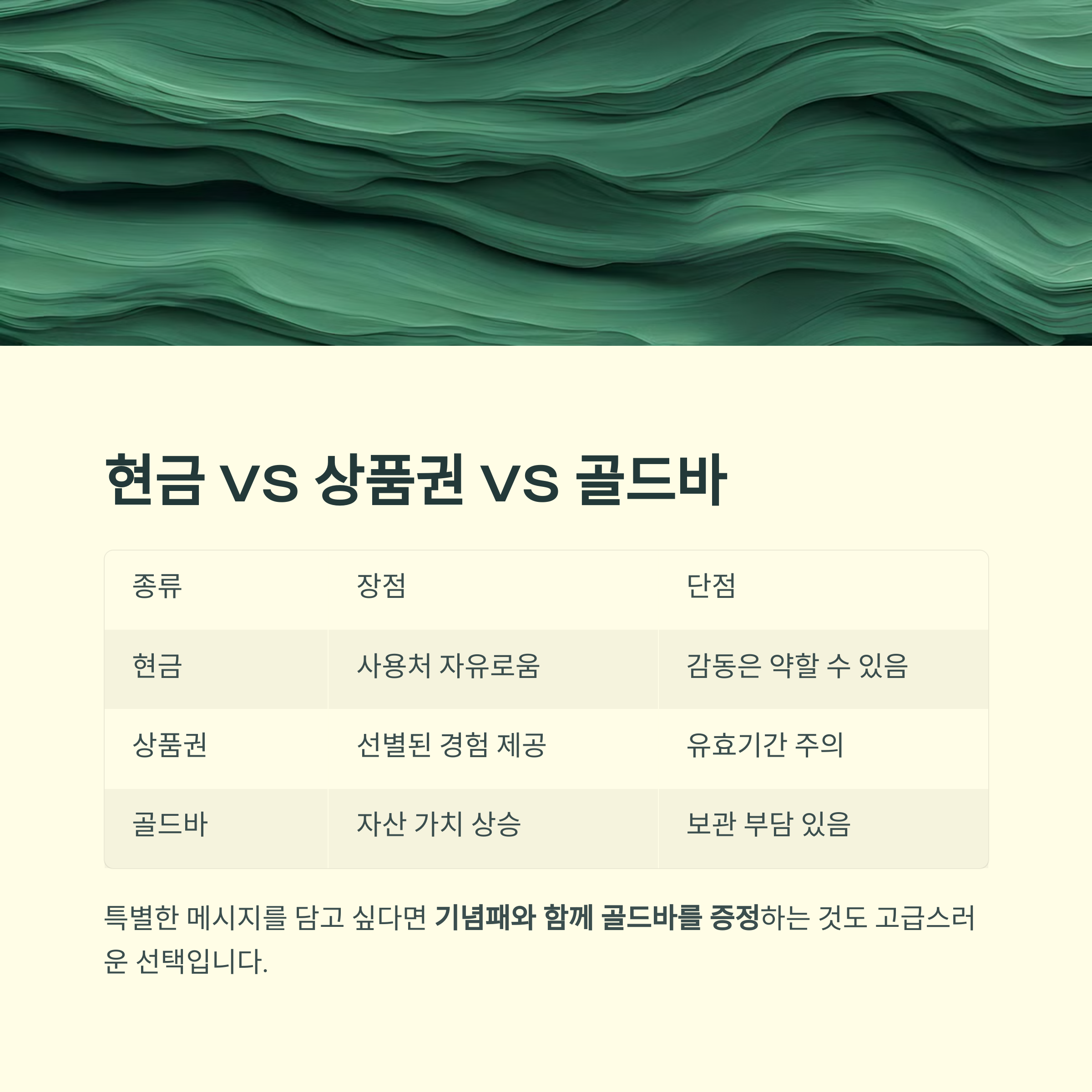 | 현금 | 사용처 자유로움 | 감동은 약할 수 있음 |