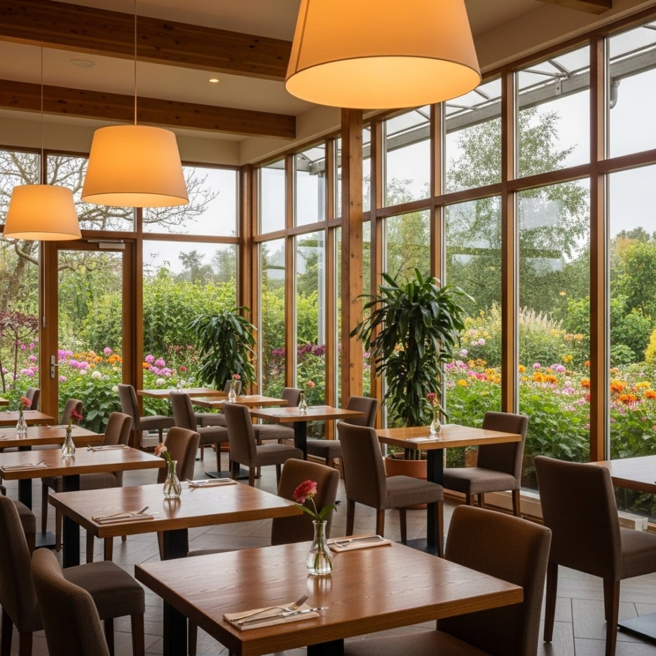 가격대는 15,000원에서 20,000원 사이로 형성되어 있으며, 창밖으로 펼쳐진 정원 뷰를 감상하며 여유롭게 식사를 즐길 수 있다는 점이 큰 장점이에요.
