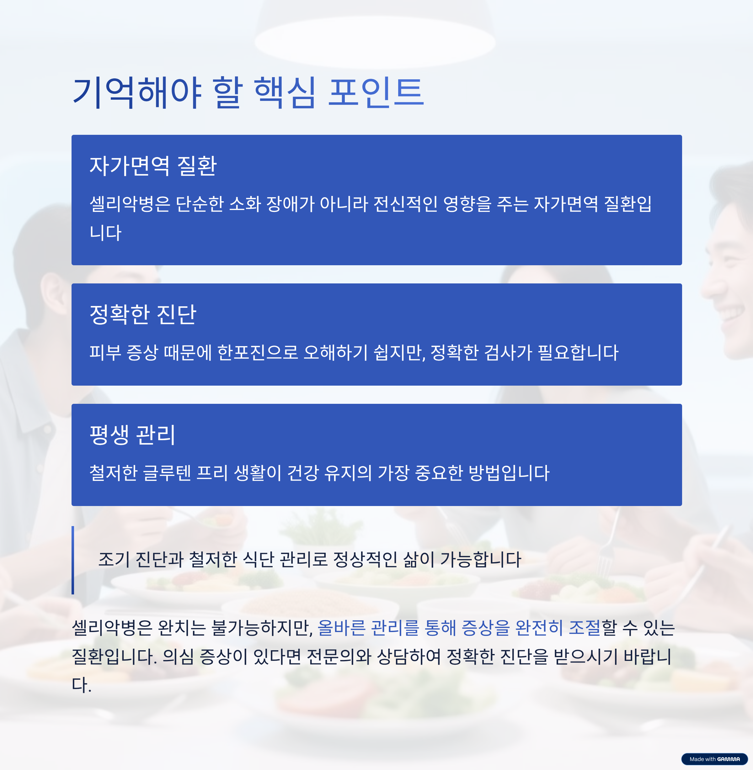 셀리악병은 단순한 소화 장애가 아니라 전신적인 영향을 주는 자가면역 질환입니다. 피부 증상 때문에 한포진으로 오해하기 쉽지만, 원인이 다르기 때문에 정확한 검사가 필요합니다. 무엇보다도 평생 철저한 글루텐 프리 생활이 건강 유지의 가장 중요한 방법입니다.
