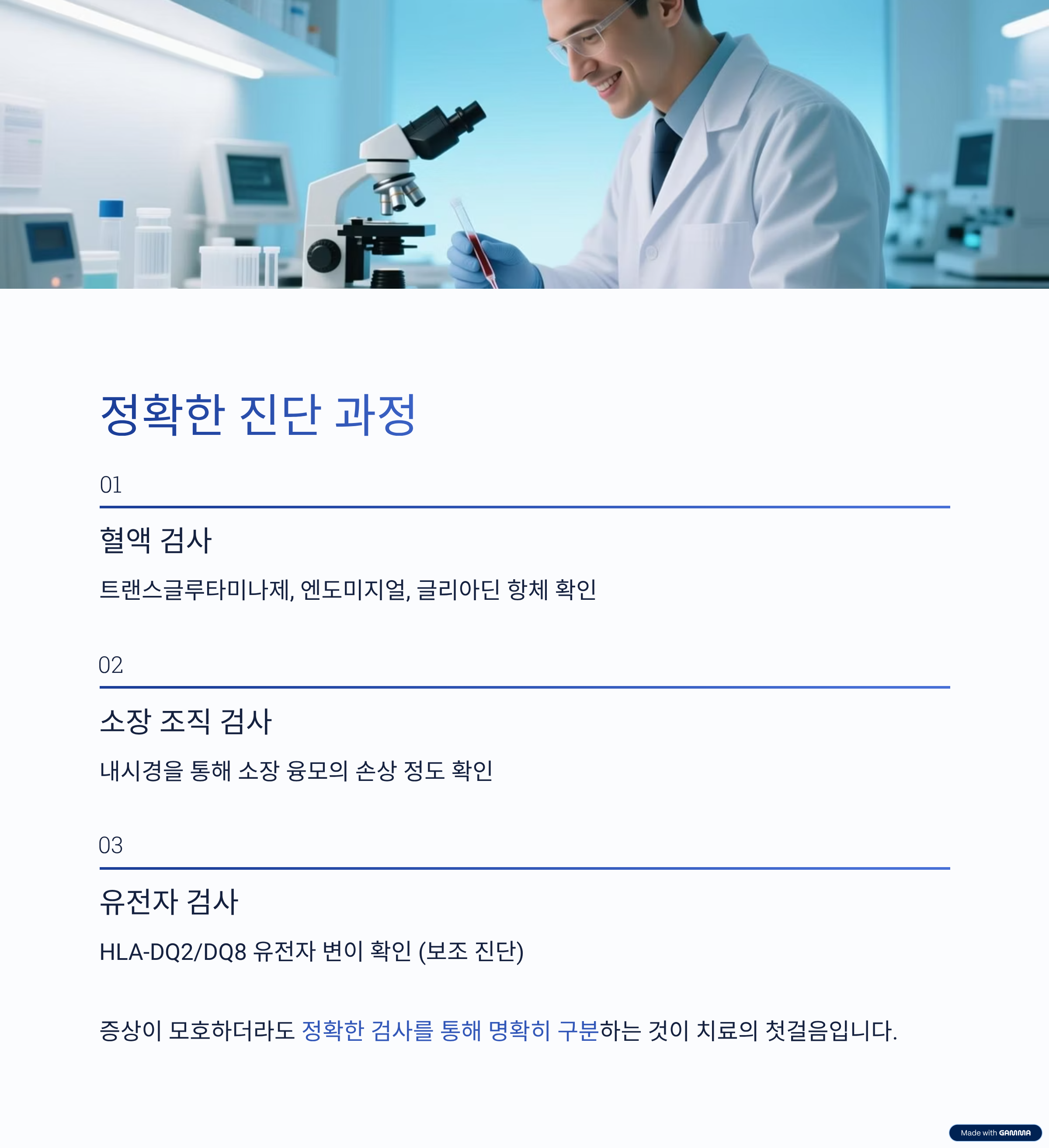 혈액 검사로 특정 항체(트랜스글루타미나제, 엔도미지얼, 글리아딘 항체)를 확인하고, 소장 조직 검사를 통해 융모가 파괴되었는지 확인합니다. 증상이 모호하더라도 검사를 통해 명확히 구분하는 것이 중요합니다.