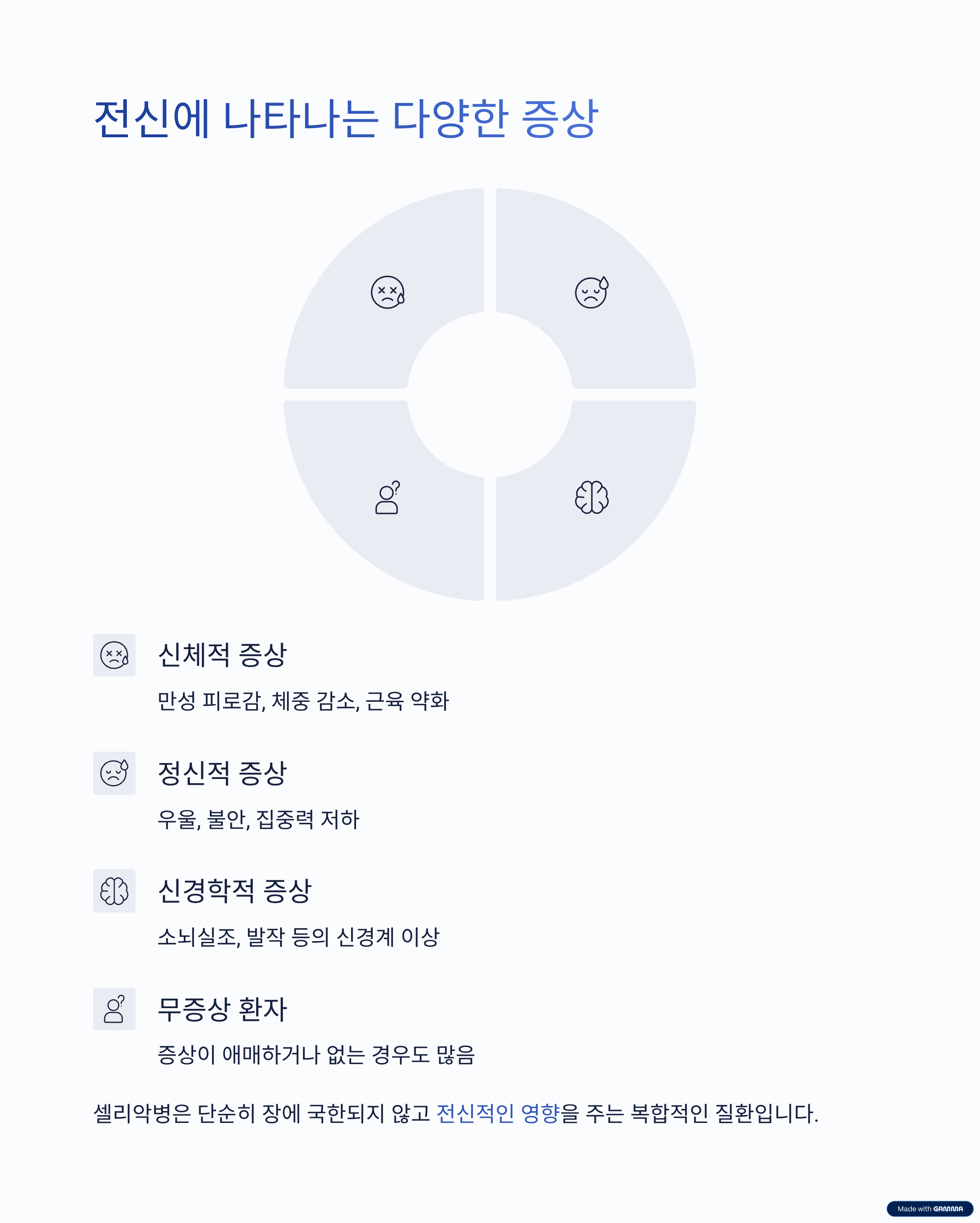 셀리악병은 단순히 장에 국한되지 않습니다. 피로감, 우울, 불안과 같은 정신적 증상뿐만 아니라 소뇌실조, 발작 같은 신경학적 증상도 보고되고 있습니다. 이 때문에 증상이 애매하거나 무증상인 환자도 많아 정확한 검사가 필요합니다.