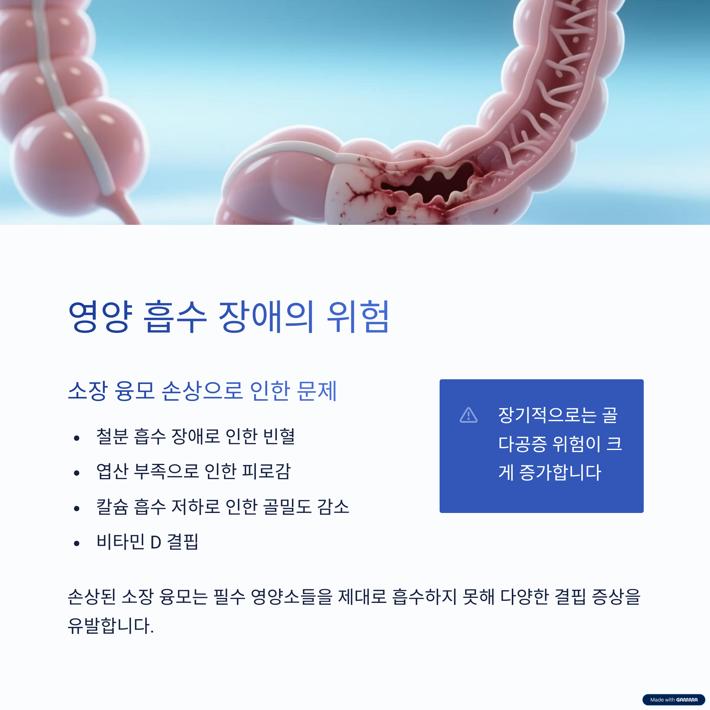 소장 융모가 손상되면 철분, 엽산, 칼슘 같은 필수 영양소가 흡수되지 않아 빈혈, 피로감, 골밀도 저하가 나타날 수 있습니다. 장기적으로는 골다공증 위험이 크게 증가합니다.