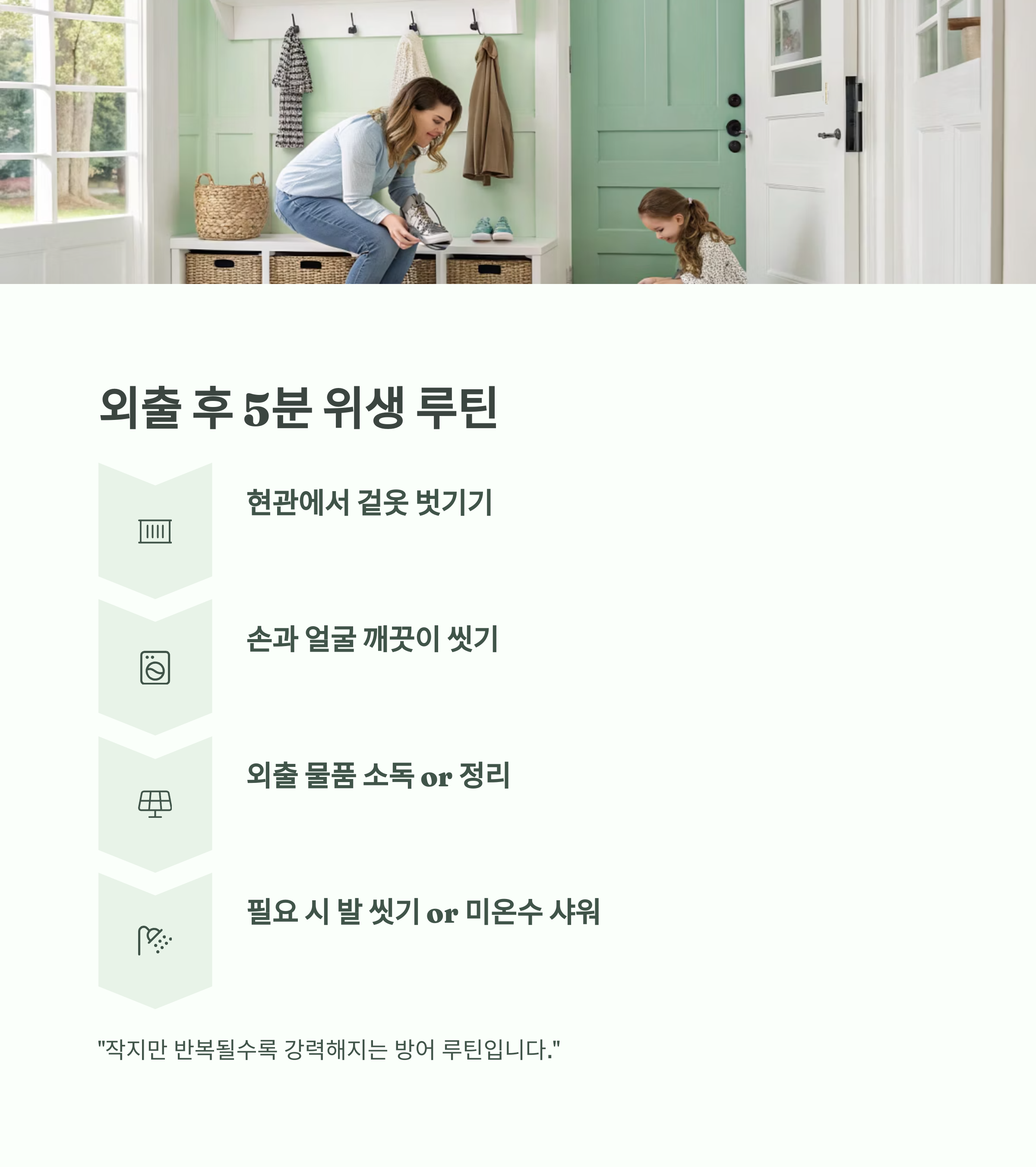 외출 후 5분간 위생 루틴을 꼭 지킬 것을 당부합니다.