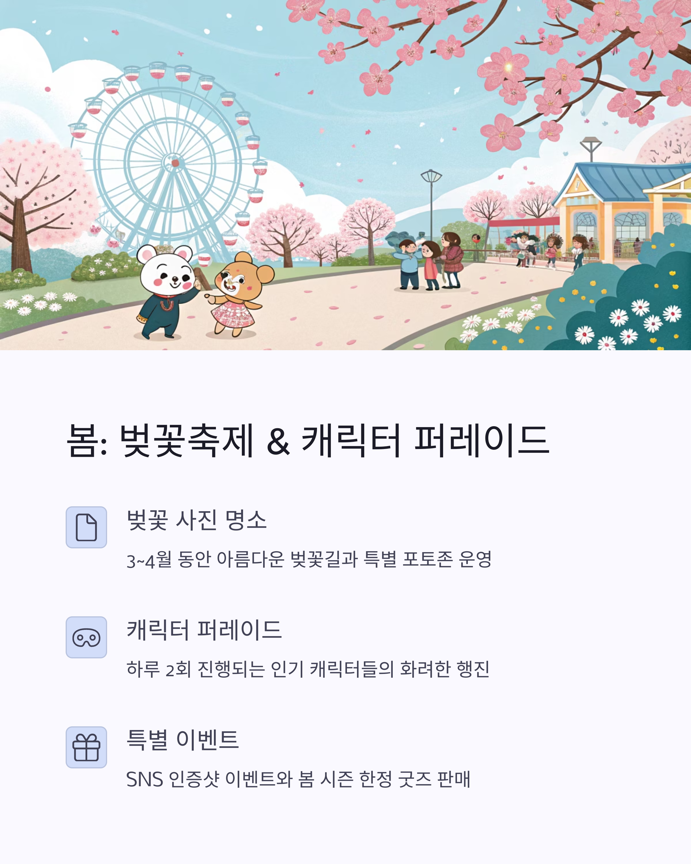 예: 에버랜드 봄꽃축제, 서울랜드 블라썸 파티