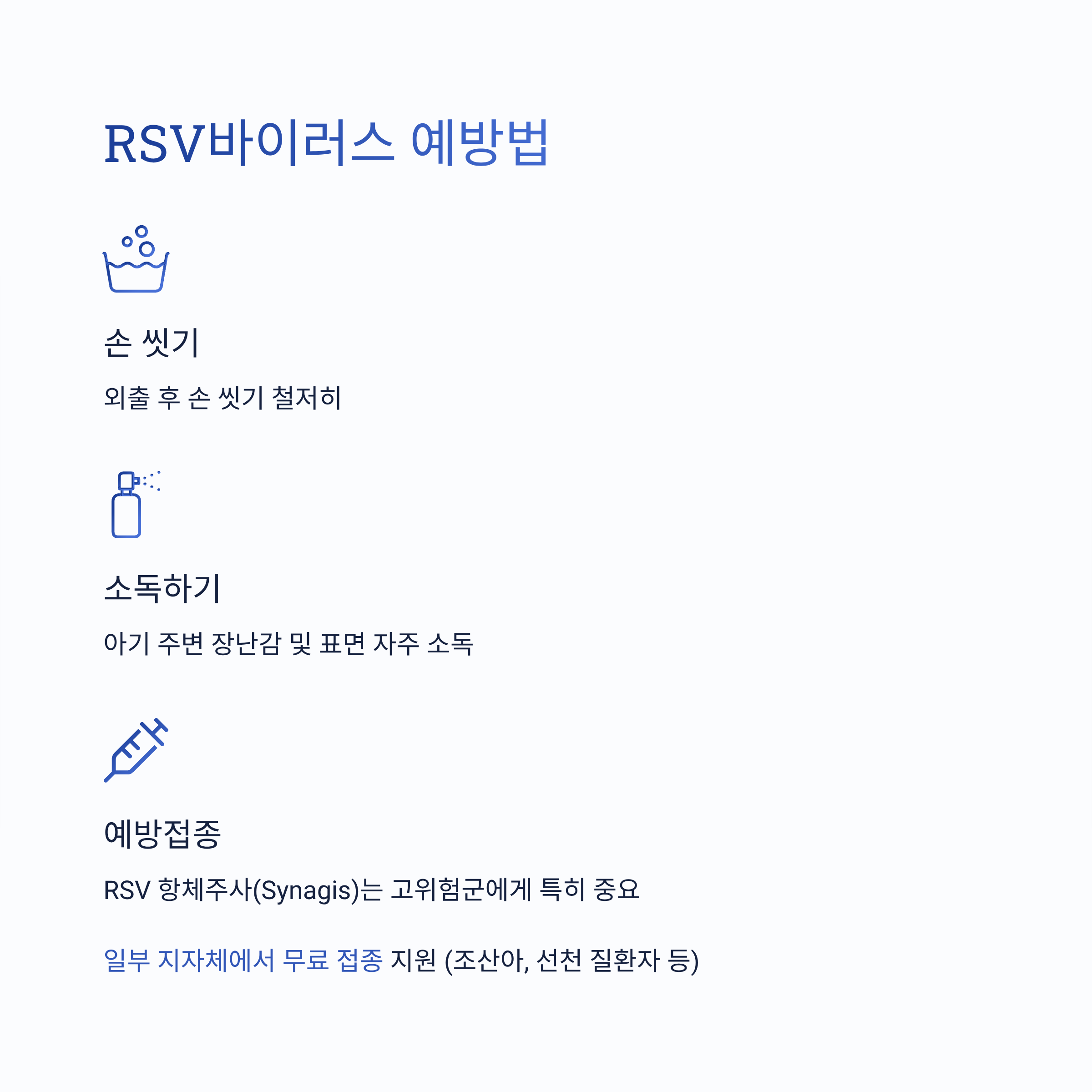 - RSV 예방접종/항체주사(Synagis 등)는 고위험군에게 특히 중요