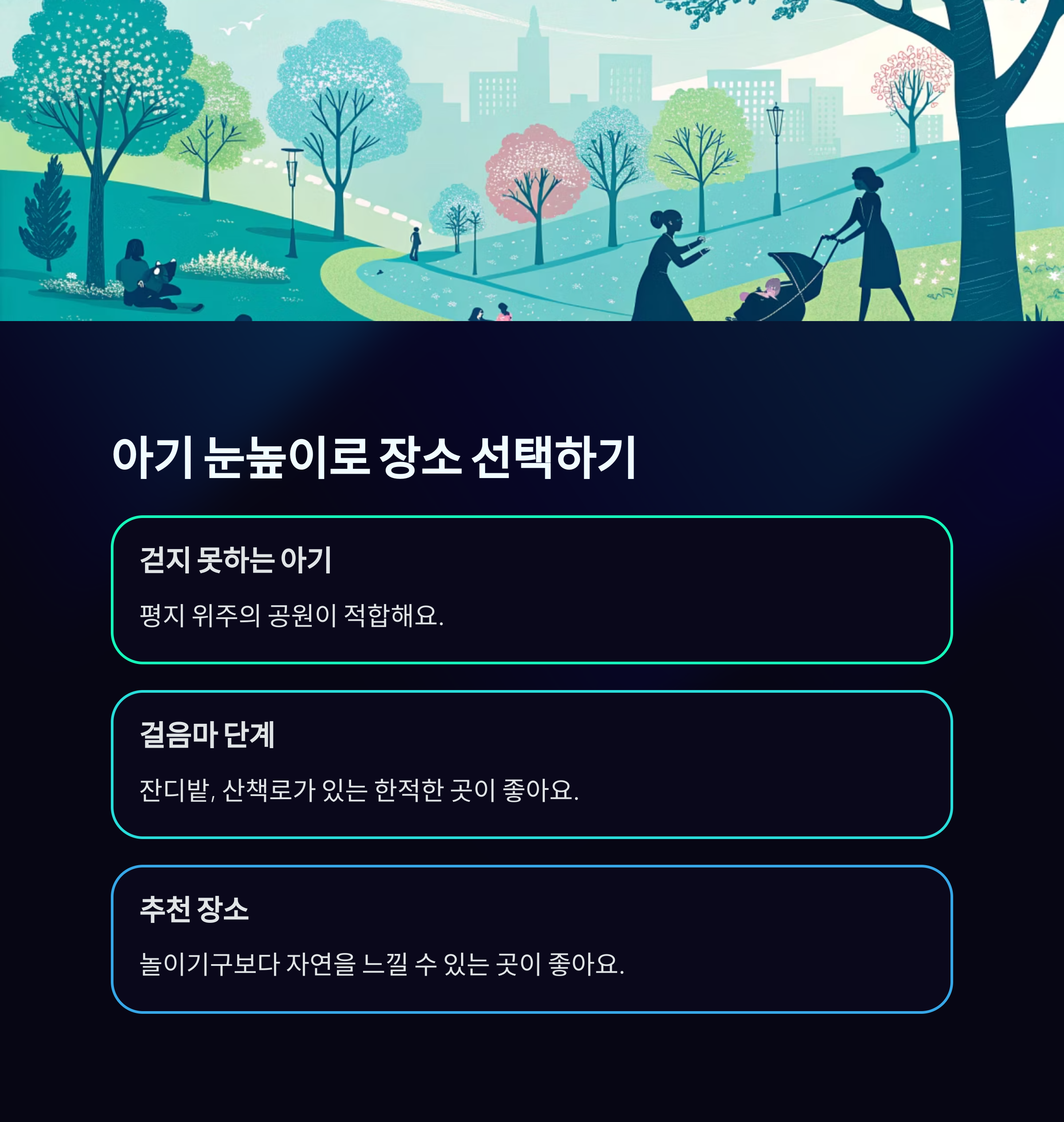 아직 걷지 못하는 아기라면 평지 위주의 공원이 적합하고,