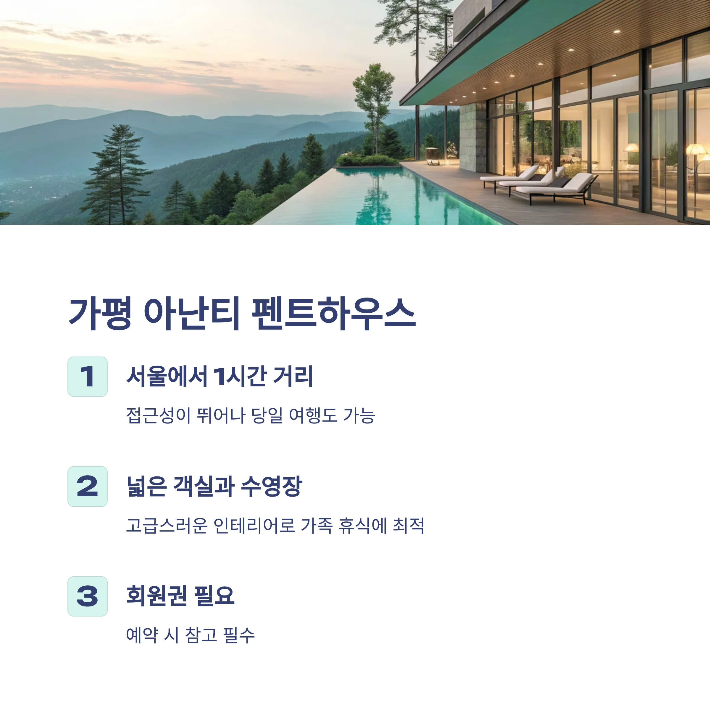 가평에 위치한 아난티 펜트하우스는 서울에서 차로 약 1시간 거리로 접근성이 뛰어납니다.