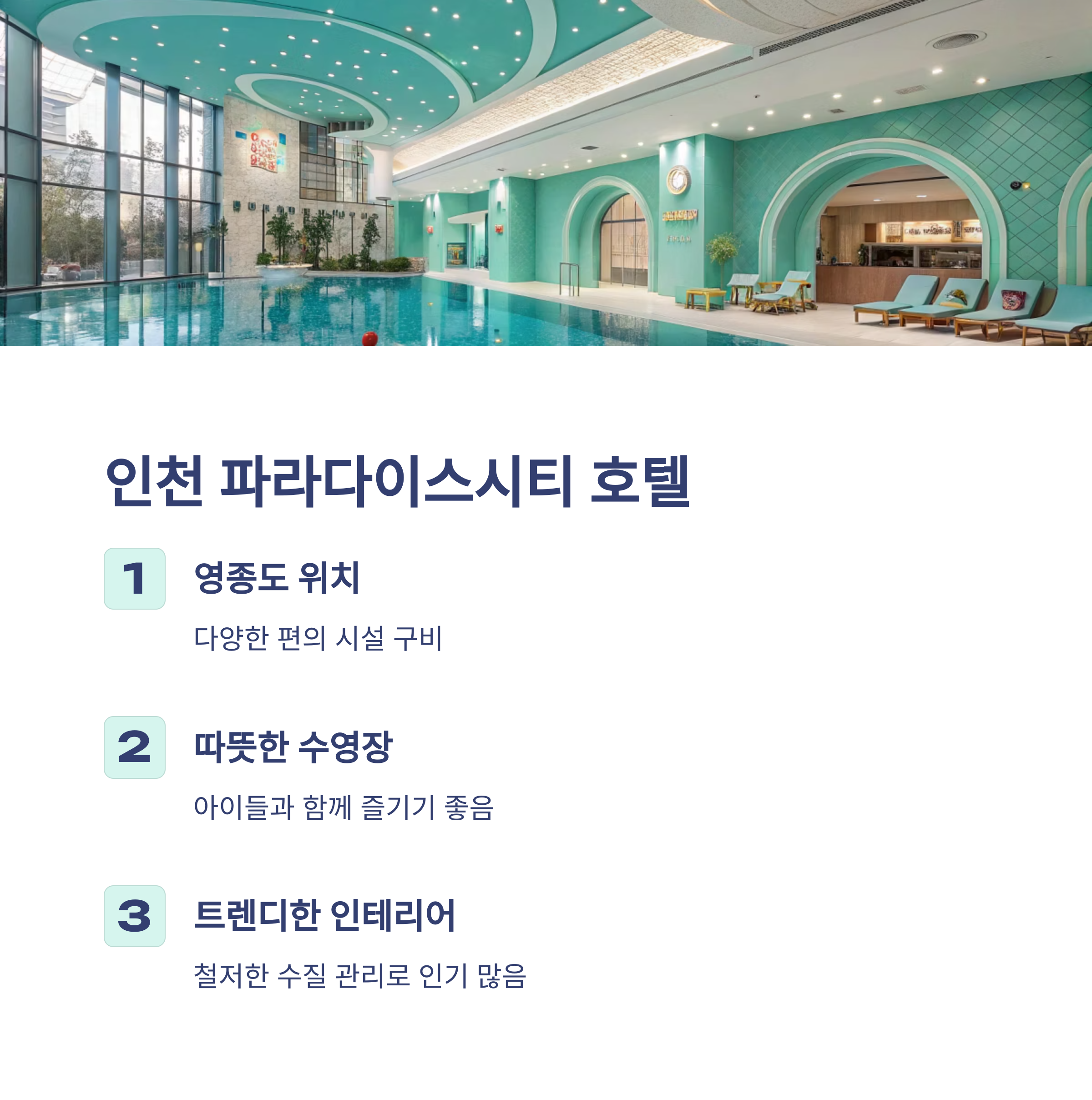 인천 영종도에 위치한 파라다이스시티 호텔은 다양한 편의 시설과 따뜻한 수영장을 갖추고 있어