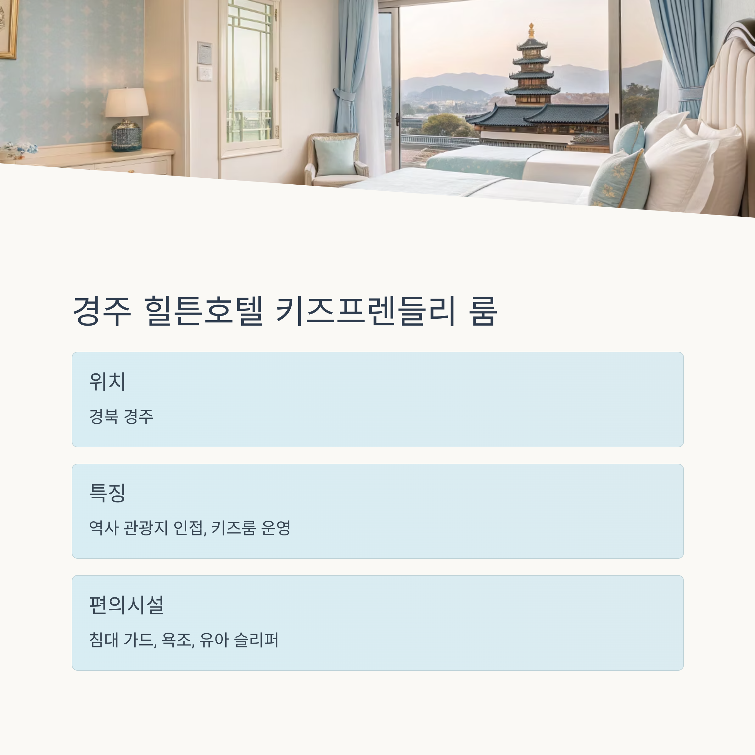 | 경주 힐튼 | 경북 경주 | 역사 관광지 인접, 키즈룸 운영 | 침대 가드, 유아 욕조 등 |