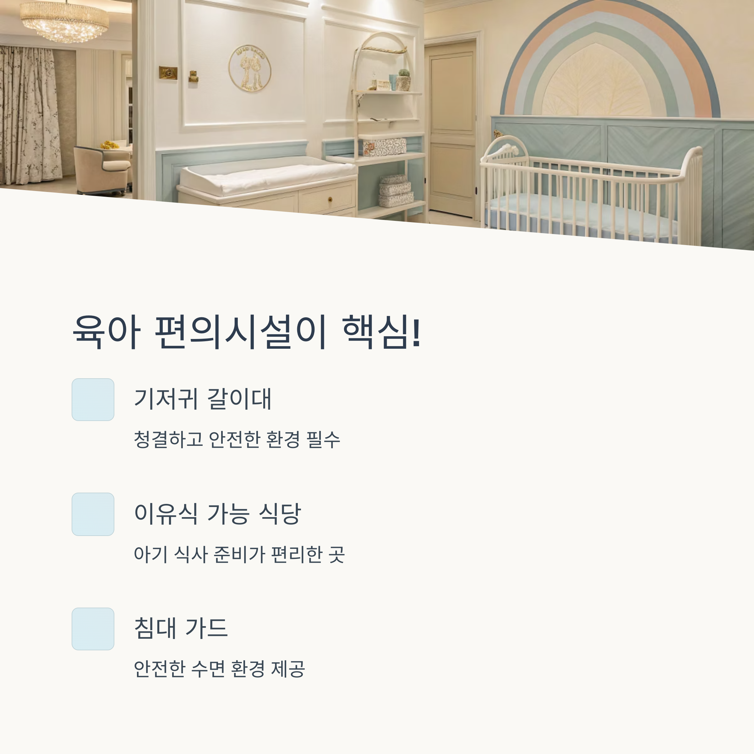 기저귀 갈이대, 이유식 가능 식당, 침대 가드 등 육아 편의시설은 필수 조건입니다