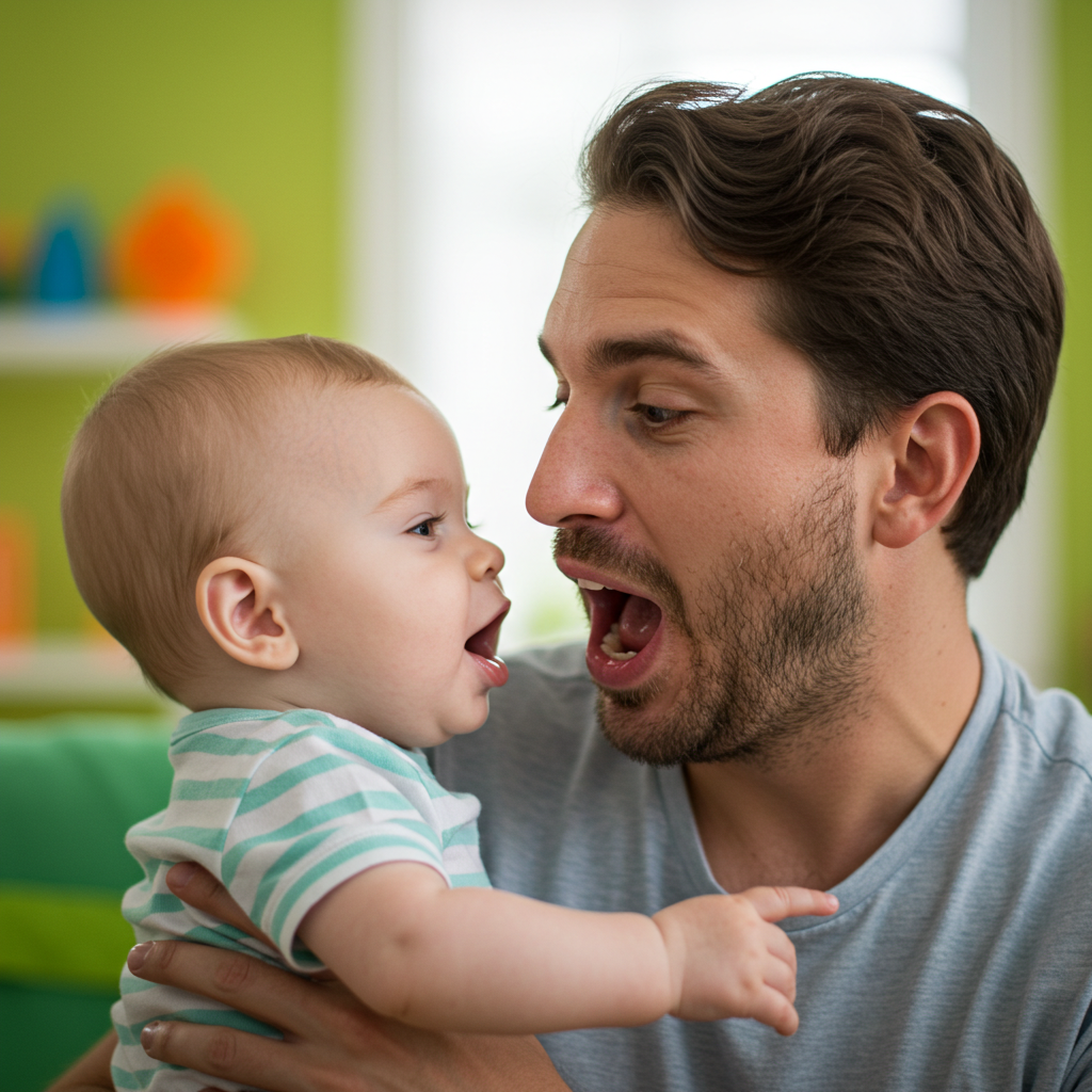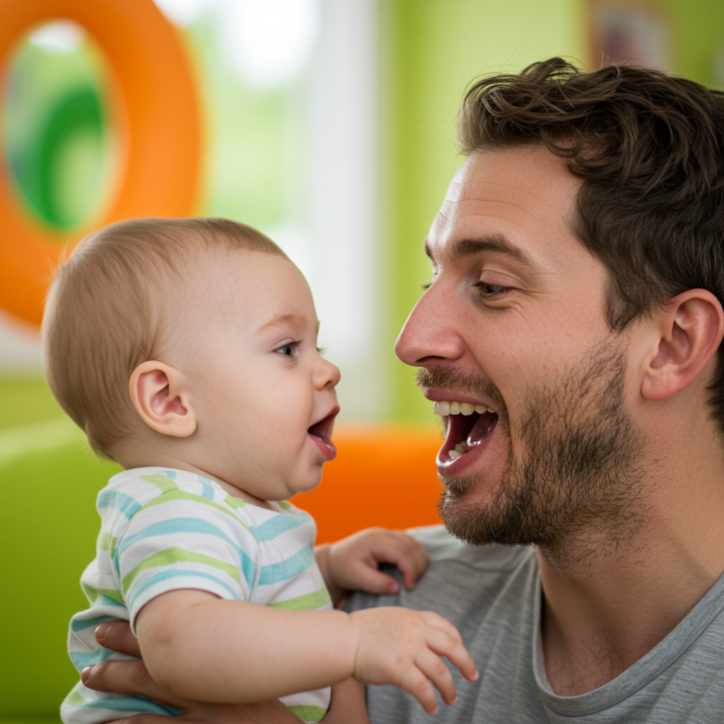 - '따라쟁이' 놀이: 아이가 "아-바-바" 같은 소리를 내면 아빠도 똑같이 "아-바-바" 하고 따라 해보세요. 거울처럼 따라 하는 아빠의 모습에 아이는 즐거워하며 더 많은 소리를 내려고 할 거예요.