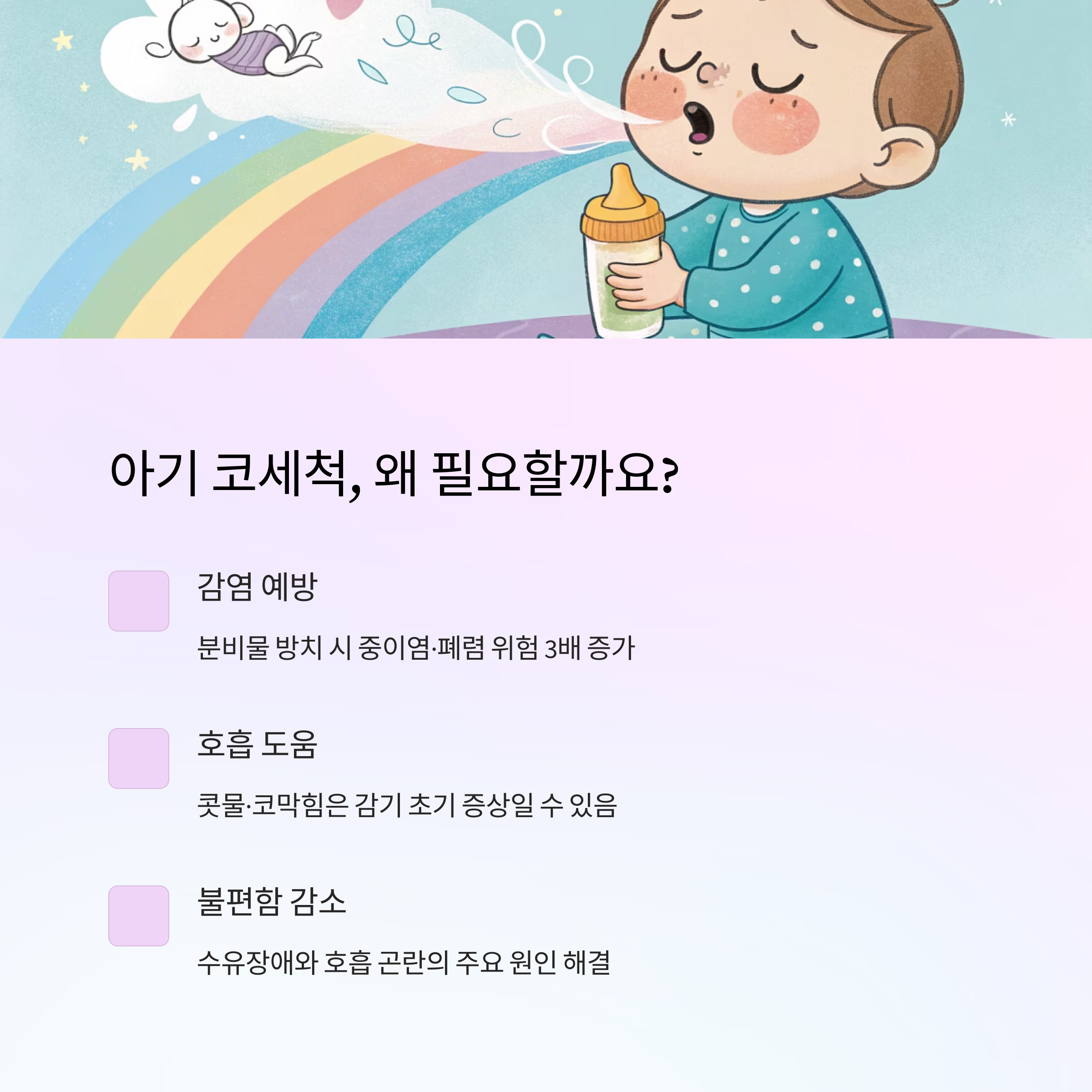 "코세척은 단순한 케어가 아닌, 아기의 건강을 지키는 핵심 루틴입니다."