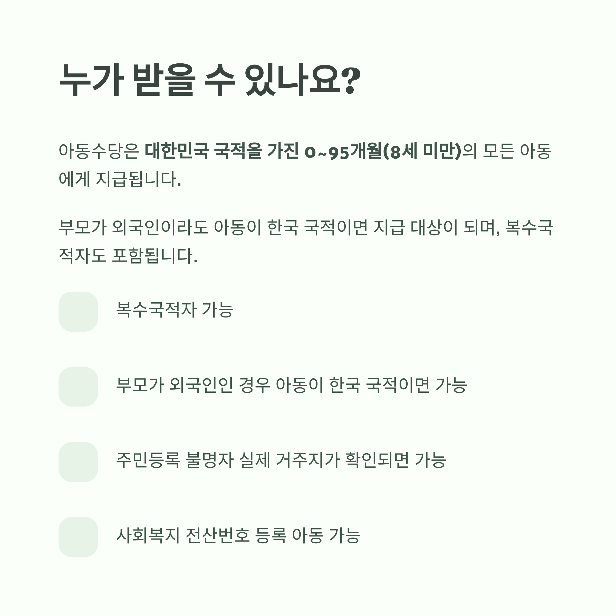 아동수당은 대한민국 국적을 가진 0~95개월(8세 미만)의 모든 아동에게 지급됩니다.