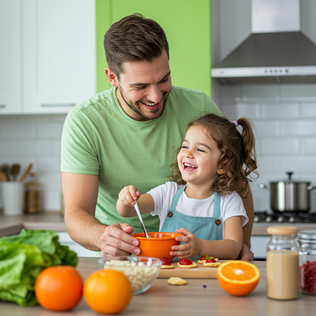 - 안전이 최우선: 칼이나 불 사용 시에는 반드시 아빠가 통제하고, 아이에게는 안전한 도구(플라스틱 칼, 가위 등)를 주어야 해요.