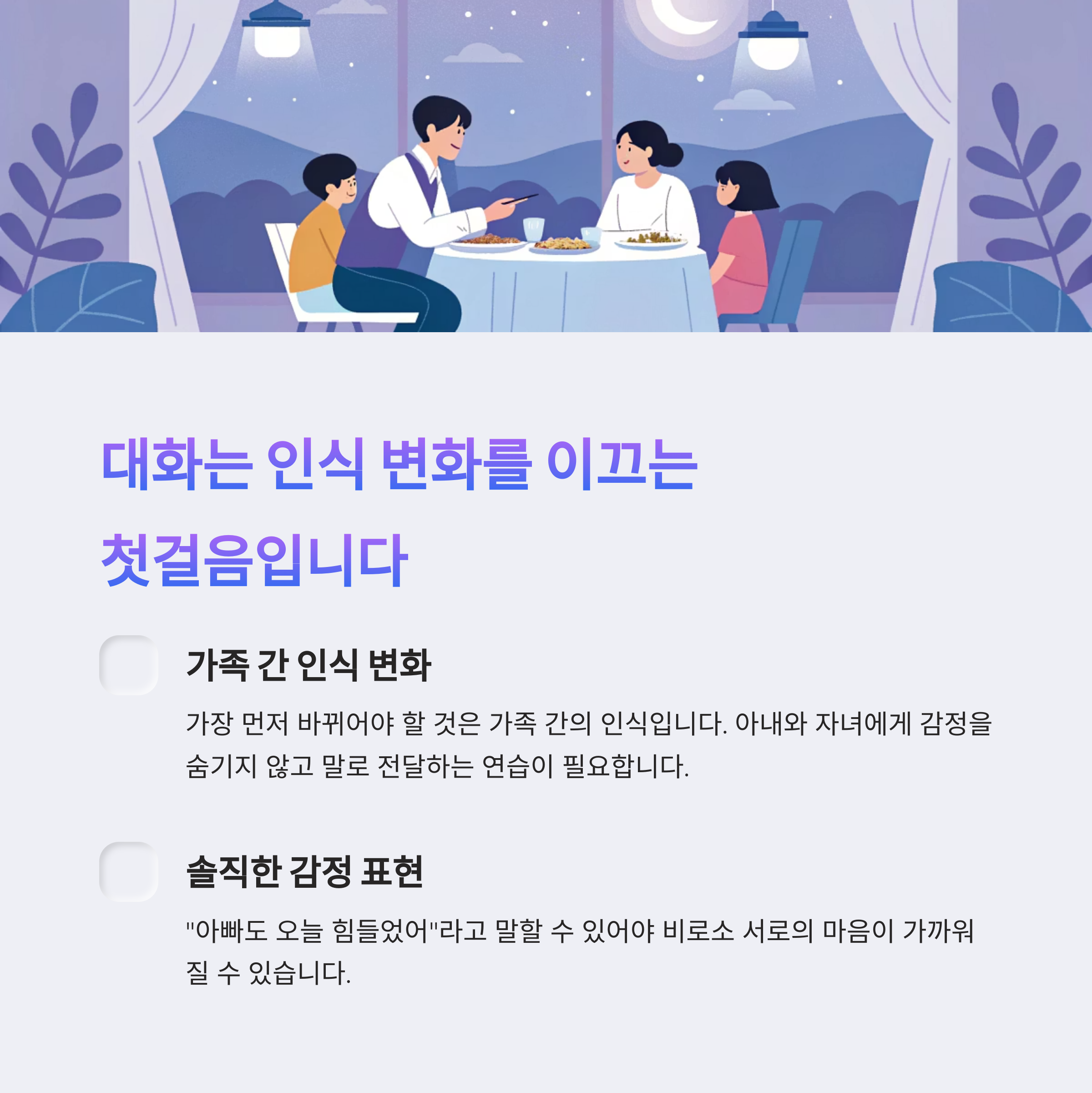 아내와 자녀에게 감정을 숨기지 않고 말로 전달하는 연습이