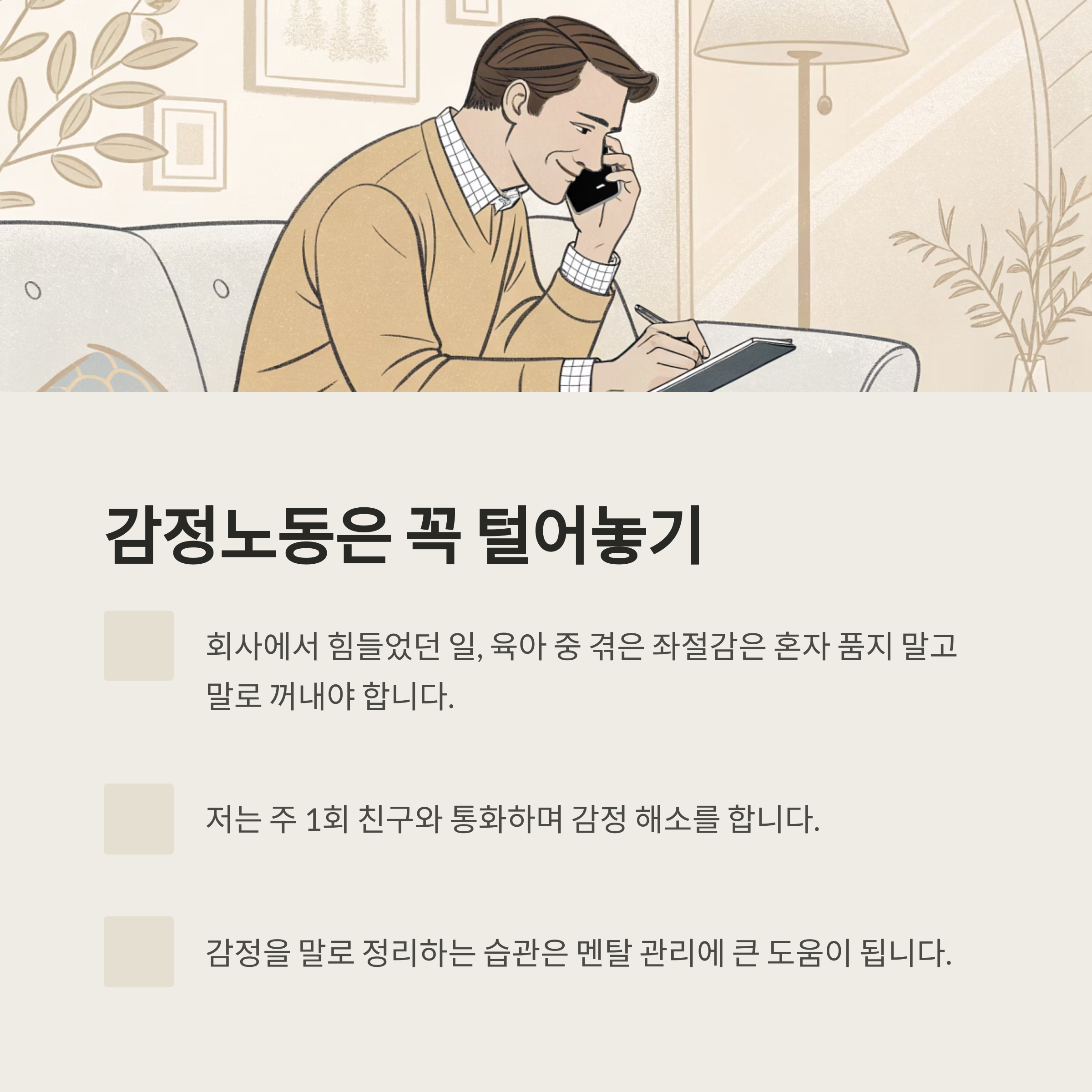저는 주 1회 친구와 통화하며 감정 해소를 합니다.
